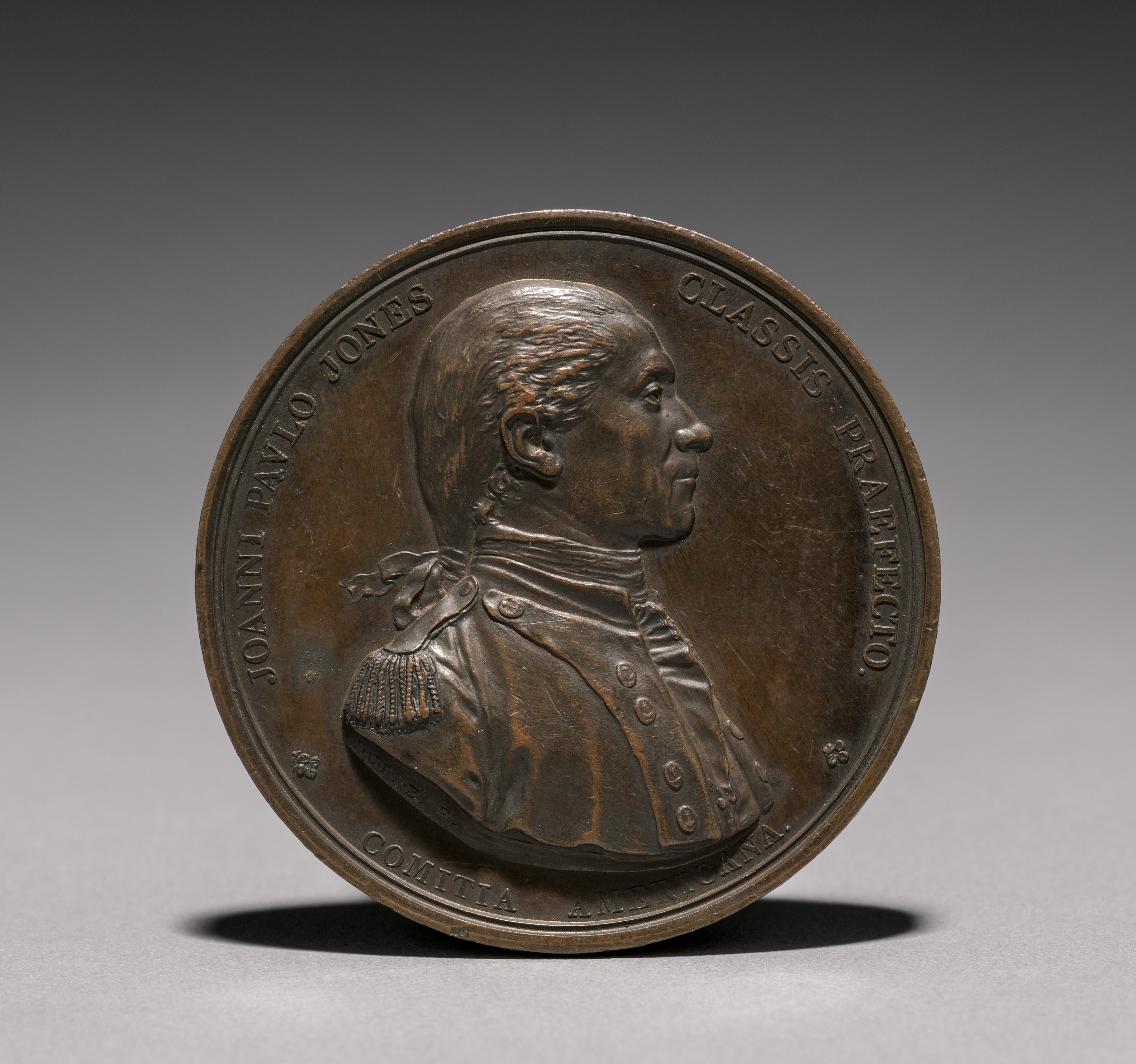 The medal features a bronze-colored, circular object with a raised profile portrait of a man. The man has short hair and wears a military-style jacket with buttons and epaulets. The top edge of the medal bears the inscription "JOANNI PAULO JONES CLASSIS PRAEFECTO". The bottom edge appears to have an inscription, but it is not legible. The medal is displayed on a gray surface with a dark background.