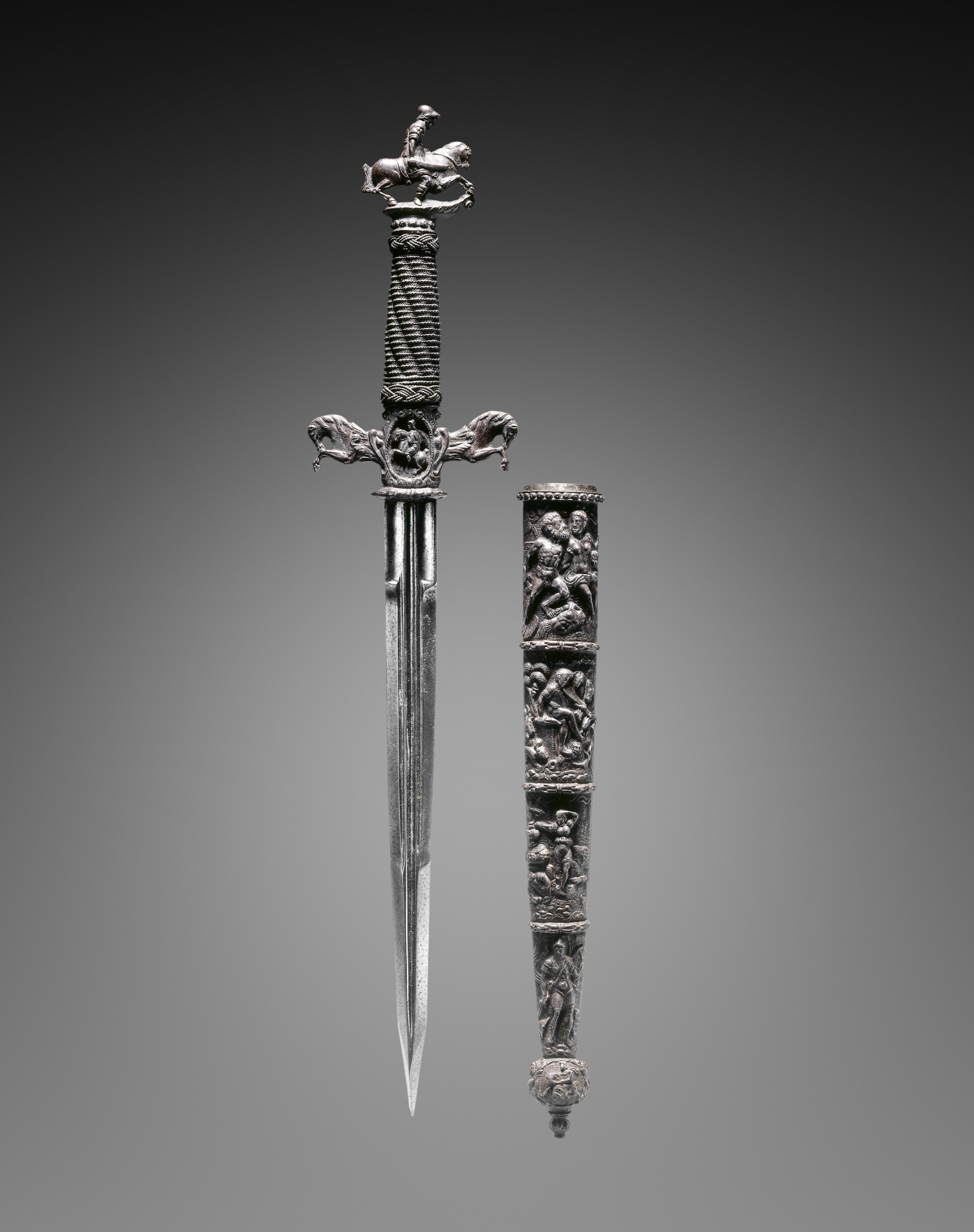 The image shows a dagger titled "Dagger" by an unidentified artist. The dagger has a long, thin blade with a sharp point. The blade is double-edged and has a central ridge running along its length. The hilt is made of metal and features a wrapped design. A decorative piece at the top of the hilt depicts a person riding a horse. Two symmetrical curved designs extend from the hilt, resembling leaves or wings. The dagger's scabbard is cylindrical and features a series of rectangular panels with raised designs depicting people and scenes. The background is a gradient that transitions from dark gray at the top to light gray at the bottom.