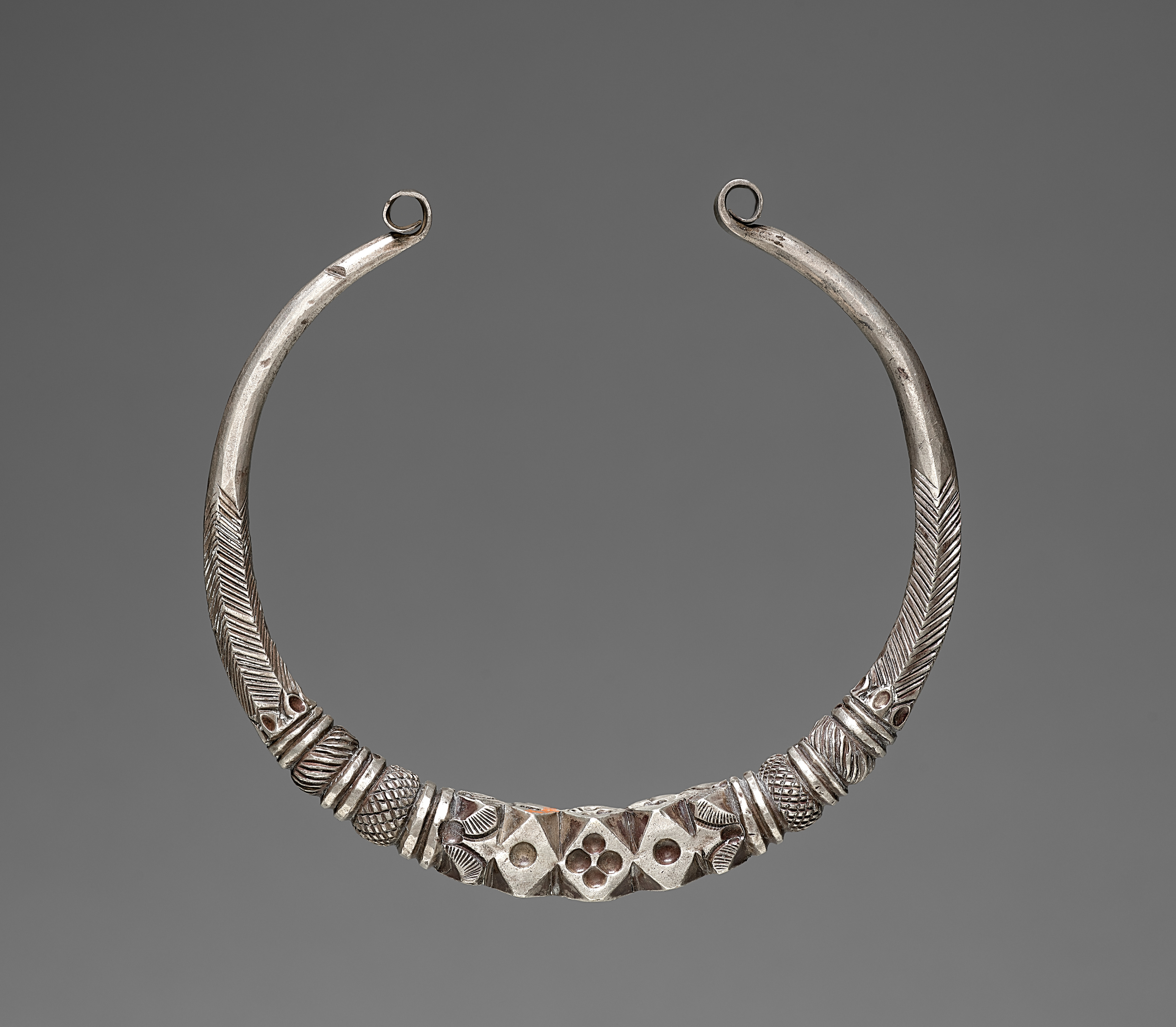 Silver neckpiece with a smooth, rounded band. The band is decorated with engraved lines on either side. The middle section features a repeating pattern of diamond and triangular shapes with flower-like cutouts. Small, spherical shapes with engraved lines are on either side of the middle section. The neckpiece ends with small circular loops at the top. Gray background.