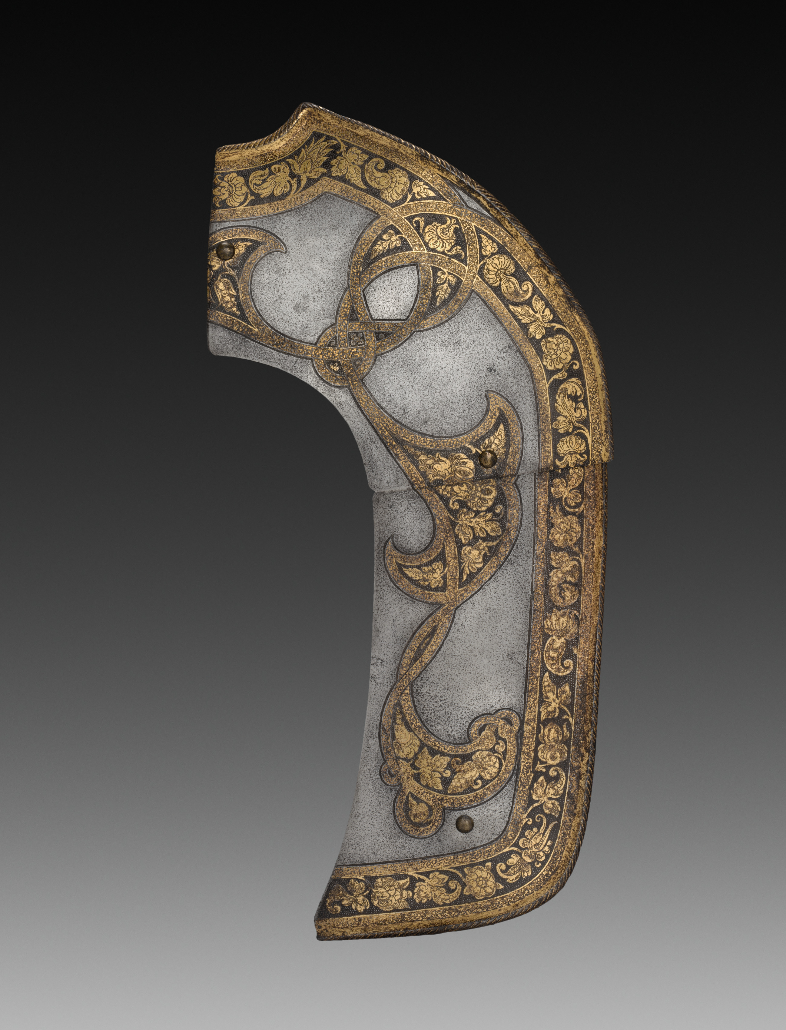 Metal plate armor piece, curved and asymmetrical shape, pointed at top, flat bottom; silver-gray color with gold accents; gold etched designs on surface, featuring intricate patterns; border around edge with etched floral motifs; gradient background transitions from black to gray. Pommel plates from garniture by Rudolf II, created by Anton Peffenhauser.