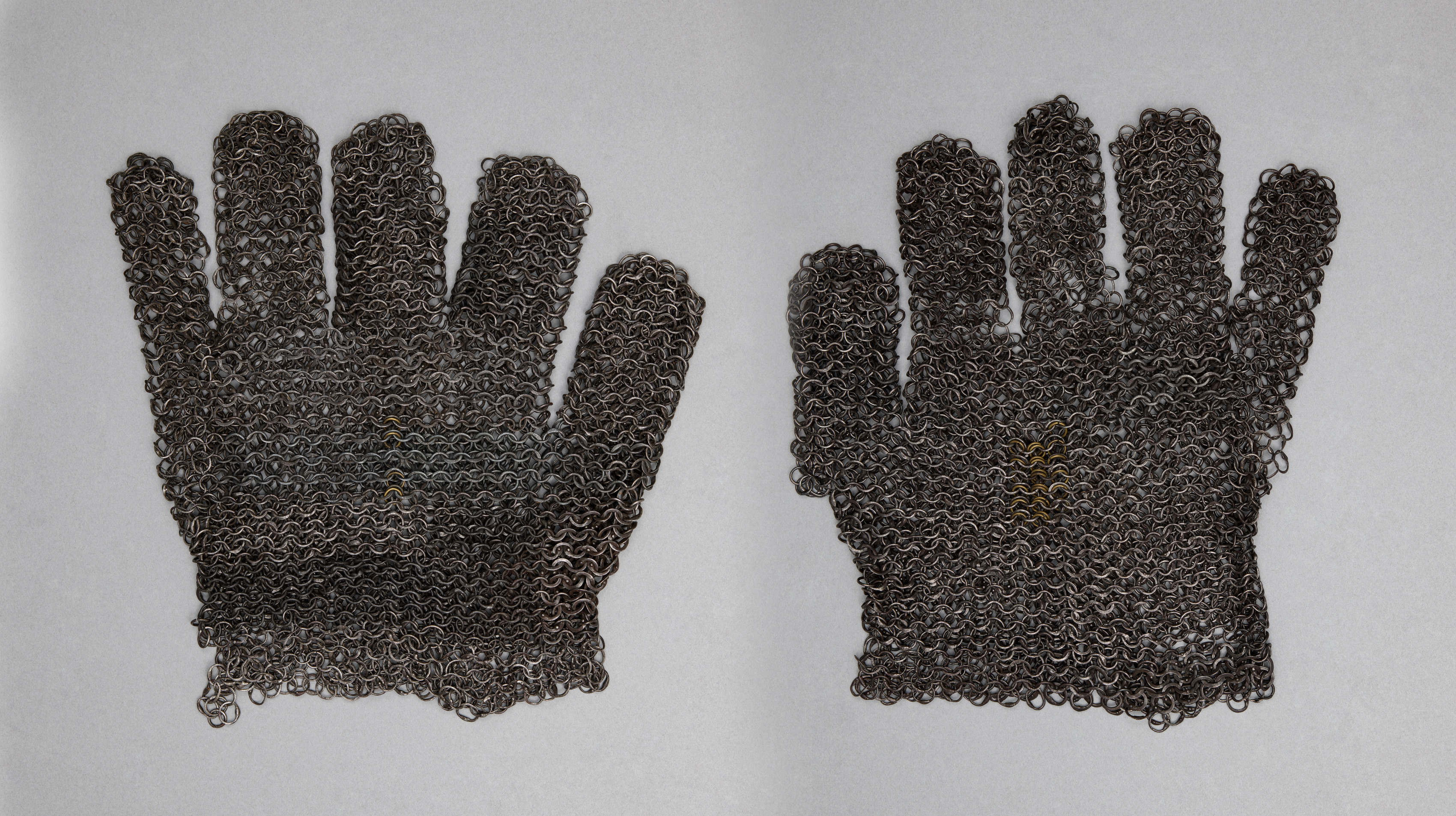 The image depicts a pair of gauntlets titled "Pair of Gauntlets" by an unknown artist. The gauntlets are made of dark metallic chainmail material. They are shaped like hands with fingers and palms. The gauntlets have four fingers and a thumb. The chainmail material is made up of small, interlocking rings. The gauntlets are positioned side by side, with the fingers pointing upwards. The background of the image is a plain gray color. The gauntlets appear to be laid flat on a surface.