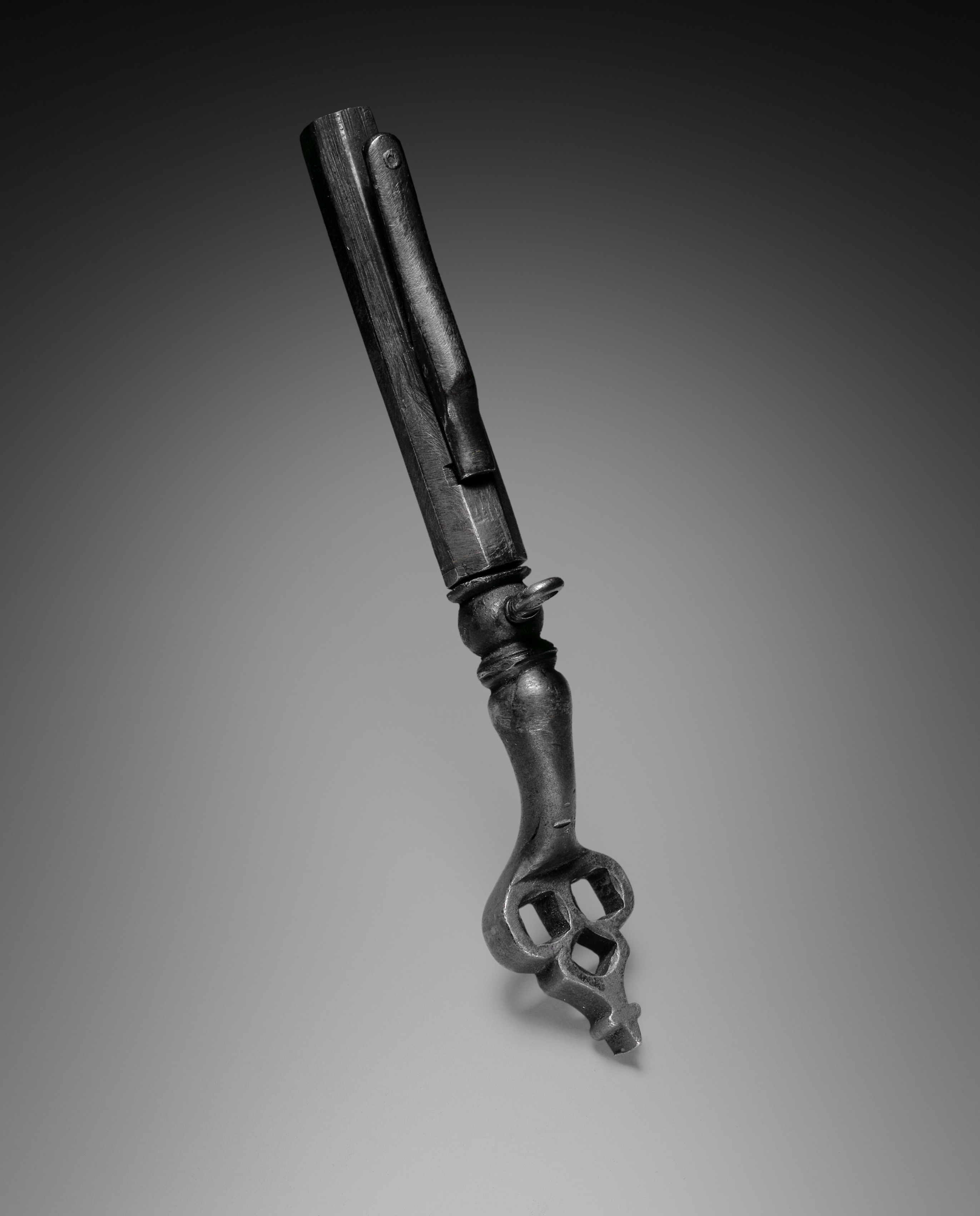 Metal object with a long handle and a wheel-lock spanner on one end and a powder measure on the other. The handle is made of metal, cylindrical, and has a slight curve. The wheel-lock spanner end is a loop with two prongs. The powder measure end is a small cup-like structure integrated into the handle. The object is dark gray or black, with visible wear and tear. The background is a gradient from dark gray at the top to light gray at the bottom.