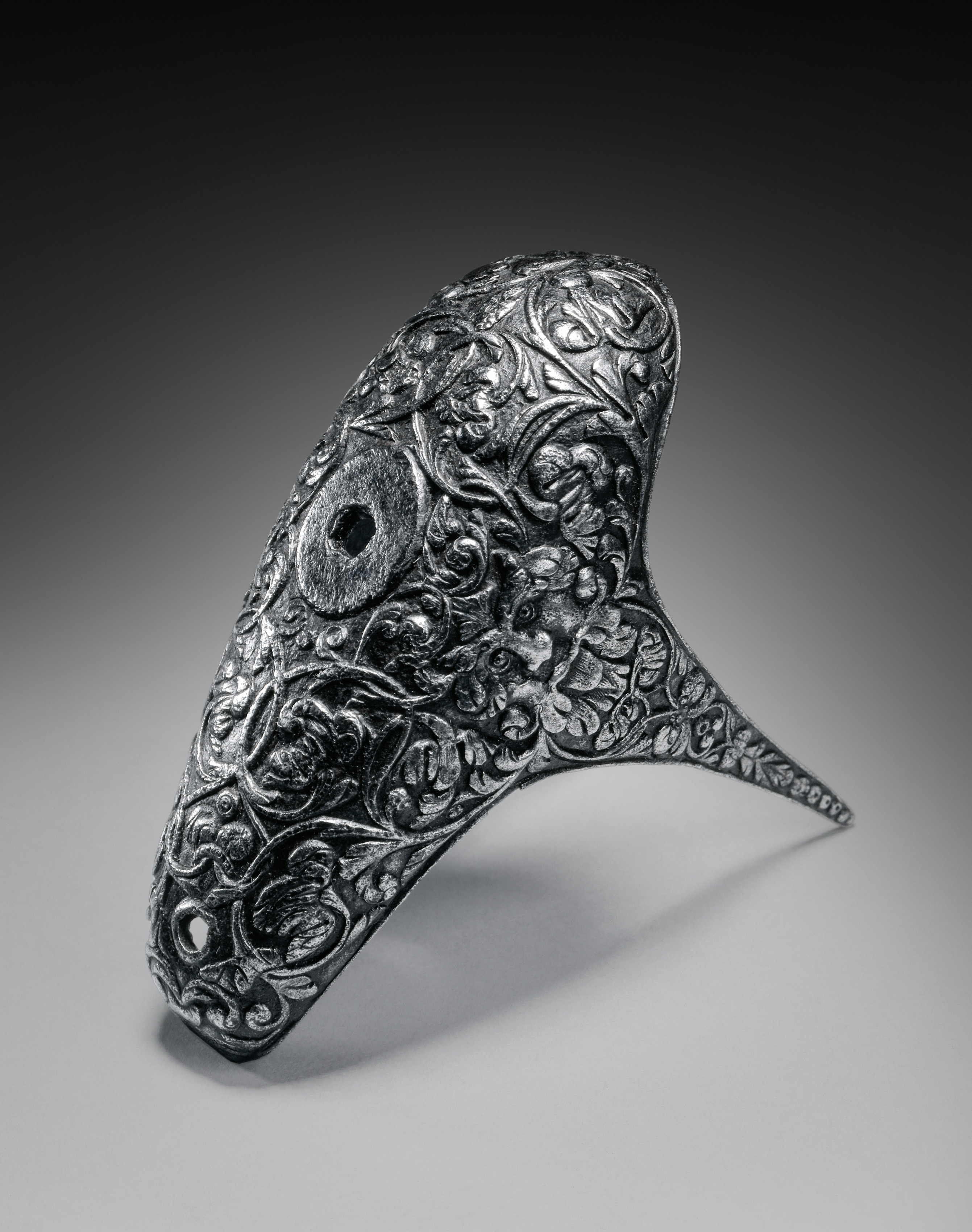 Metal butt-cap from a flintlock pistol, made of dark metal, possibly silver or steel, with an intricate design of leaves and flowers. The cap is shaped to fit the butt of a pistol, with a curved top and a flat bottom. A small hole is visible on the top left. The background is a gradient from dark to light gray.