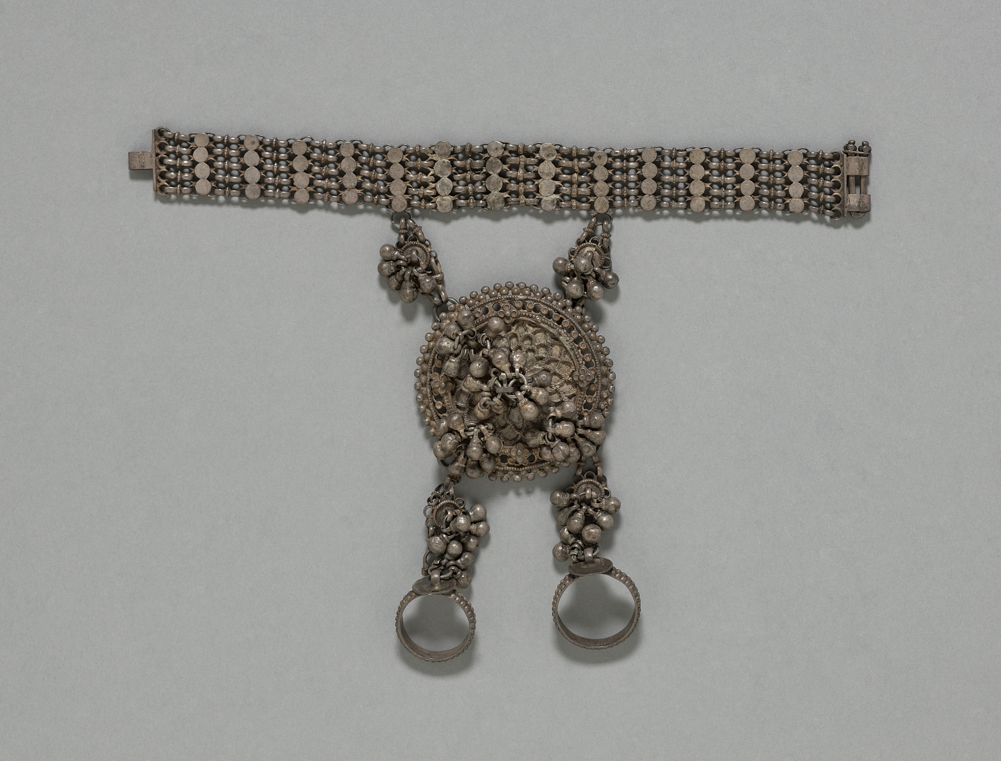 The image shows a bracelet and two rings. The bracelet is made of metal and has a rectangular shape with a patterned design. The bracelet is composed of small round beads and oval shapes connected in rows. The bracelet has a clasp on one side. Attached to the bracelet is a large circular piece with a decorative design. The circular piece has two chains with clusters of small round beads hanging from it. The two rings are hanging from the bottom of the circular piece. The background of the image is a plain gray color. The artist and title of the piece are "Rings and Bracelet".