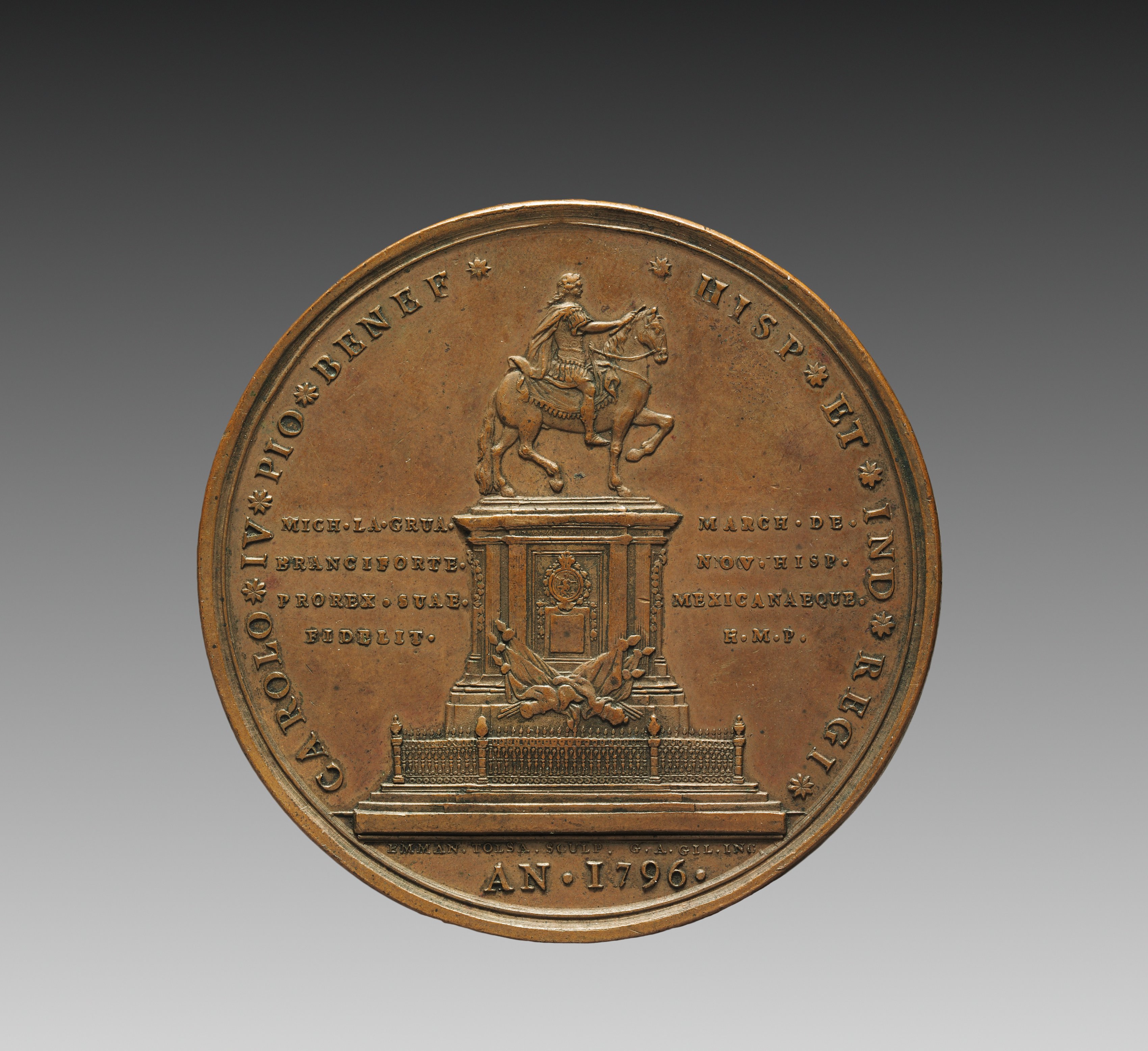 Copper-colored medal with raised images and text. The medal is circular. The obverse side shows a man on horseback on top of a pedestal. The man wears a cape and a hat. The pedestal features a shield with a crest. The pedestal has columns on the sides. There is a winged figure on the bottom of the pedestal. The medal has a raised border. The border contains text which reads "CAROLO IV * PIO BENEF * HISP ET IND * REGI". Underneath the image on the medal is more text which reads "MICHAEL ANG BRANCIFORTE PRO MEX GUV EDULGAT" on the left, and " MARCH 8 ED NOVEMBRIS MEMORIALE EQVITATIS H M D" on the right. The bottom of the medal reads "AN * 1796 *". The background of the image is gray, dark at the top and light at the bottom.