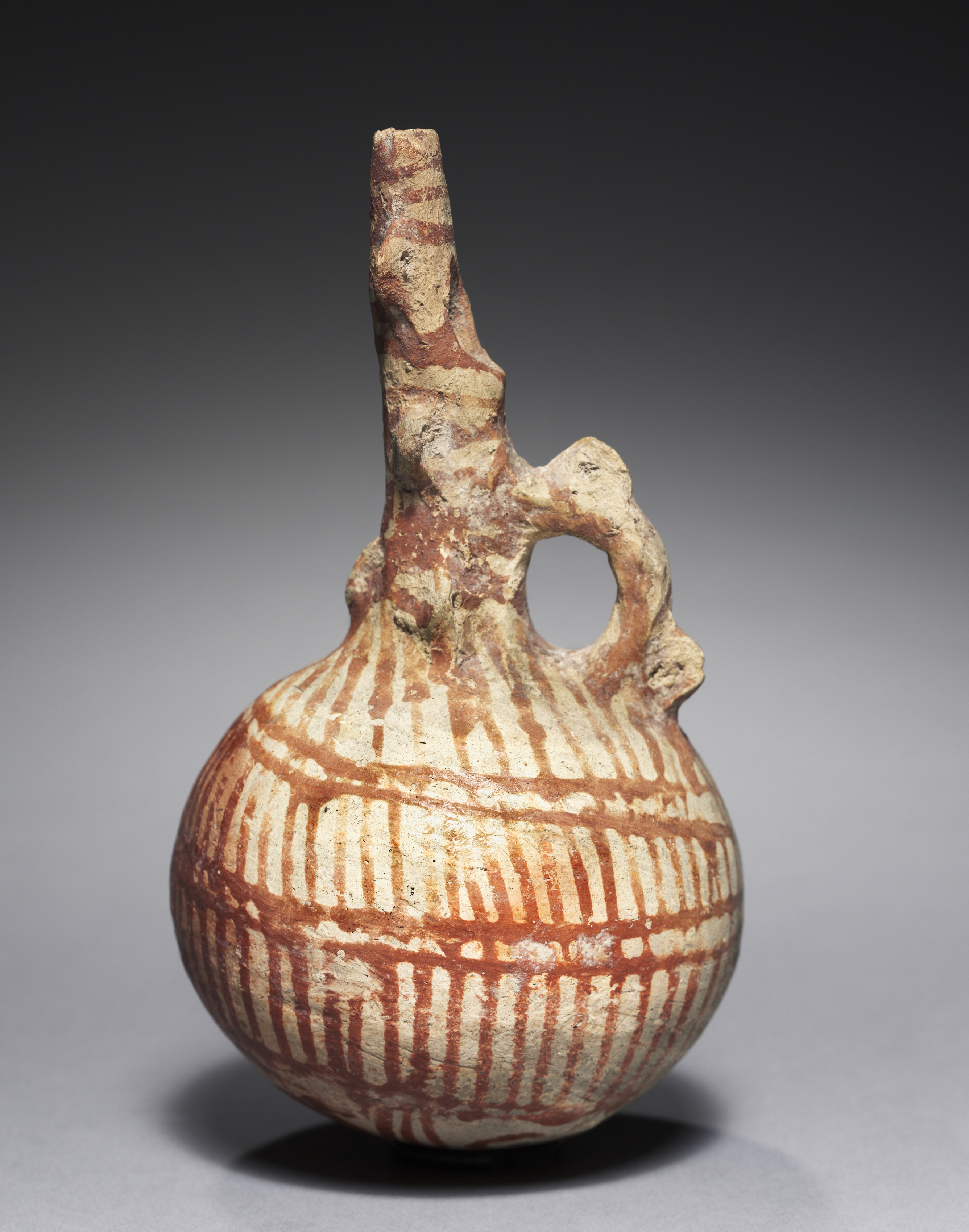 The Jug by Pablo Picasso is a ceramic vessel with a bulbous body and a long, narrow neck. The body of the jug is primarily beige with reddish-brown stripes and geometric patterns. A handle is attached to the side of the jug, and the spout is long and narrow. The jug sits on a gray surface against a gray background that darkens towards the top. The overall appearance of the jug is rustic and earthy, with visible imperfections in the ceramic material.
