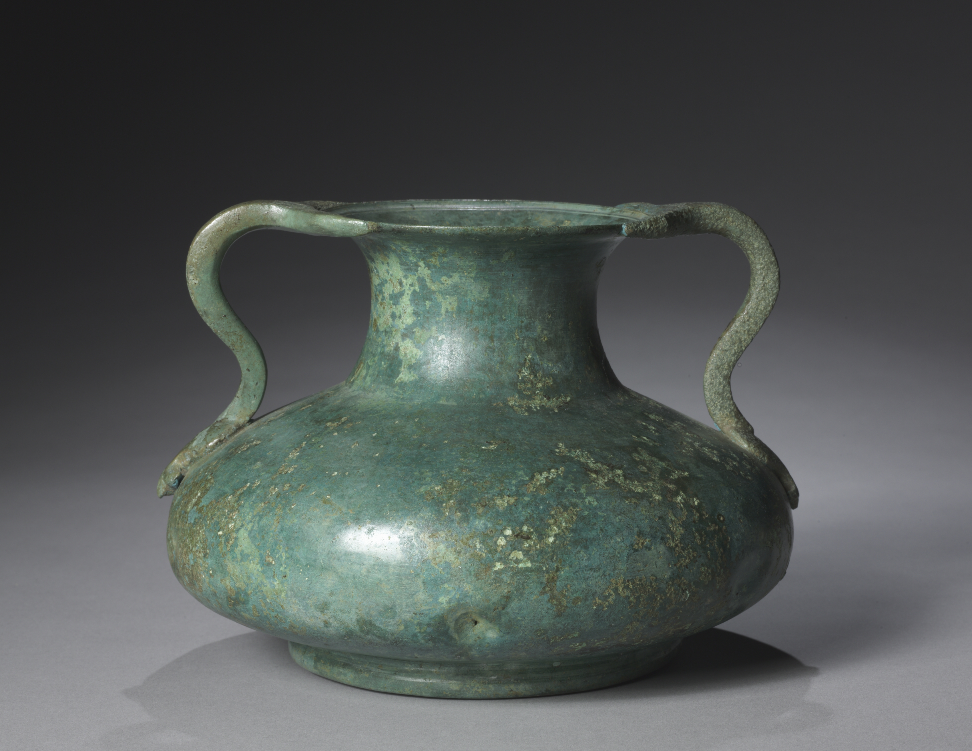 Green vase with two handles. Bulbous body, narrow neck, wide mouth. Green patina with brown spots. Gray background.