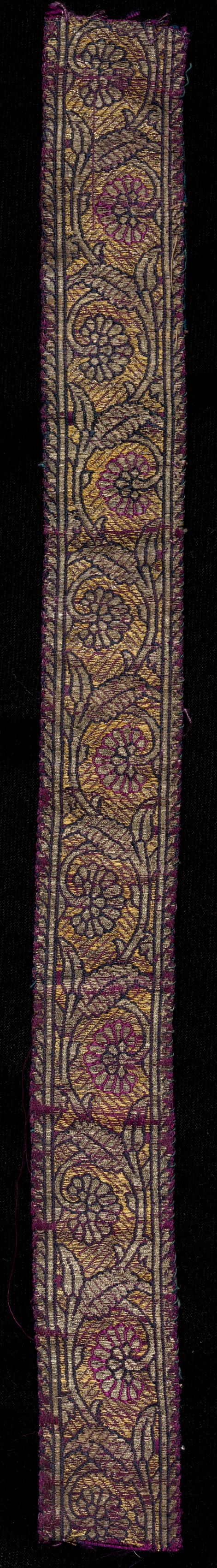 The title of the image is "Narrow Strip used as Galloon" by an unknown artist. The image shows a long, narrow strip of fabric with a repeating pattern. The strip is vertical and centered in the image. The background of the image is black. The strip has a thin, solid border on either side. The pattern on the strip features interlocking floral designs in shades of gold, purple, and black. The floral designs are symmetrical and repeat along the length of the strip. The colors in the pattern are muted and appear to be woven or embroidered. The edges of the strip are rough and frayed.