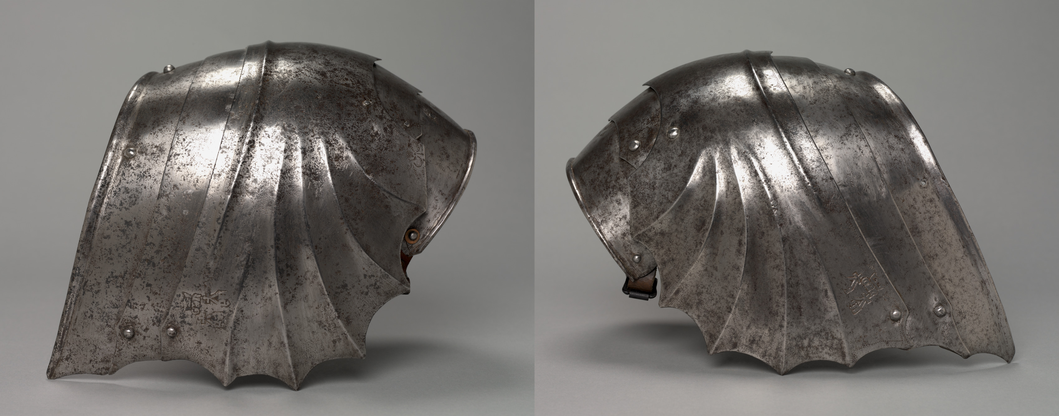 Pair of Gothic Fan-Shaped Pauldron by Antonio Missaglia. Two metallic grey, fan-shaped pauldron armor pieces, each with a semi-circular profile. The pauldrons have a series of curved, overlapping plates resembling a fan or a scallop shell. They are made of metal with a weathered appearance and visible signs of wear, including darker spots and discoloration. The surface of the pauldrons is shiny in some areas, reflecting light. Each pauldron has a small eyelet on the front edge and several rivets along the sides and top. The background is a plain gray color with each pauldron casting a shadow on the surface below. The two pauldron pieces are shown from different angles; one piece faces slightly forward and to the right while the other faces slightly backward and to the right. The edges of the pauldrons have a wavy pattern.