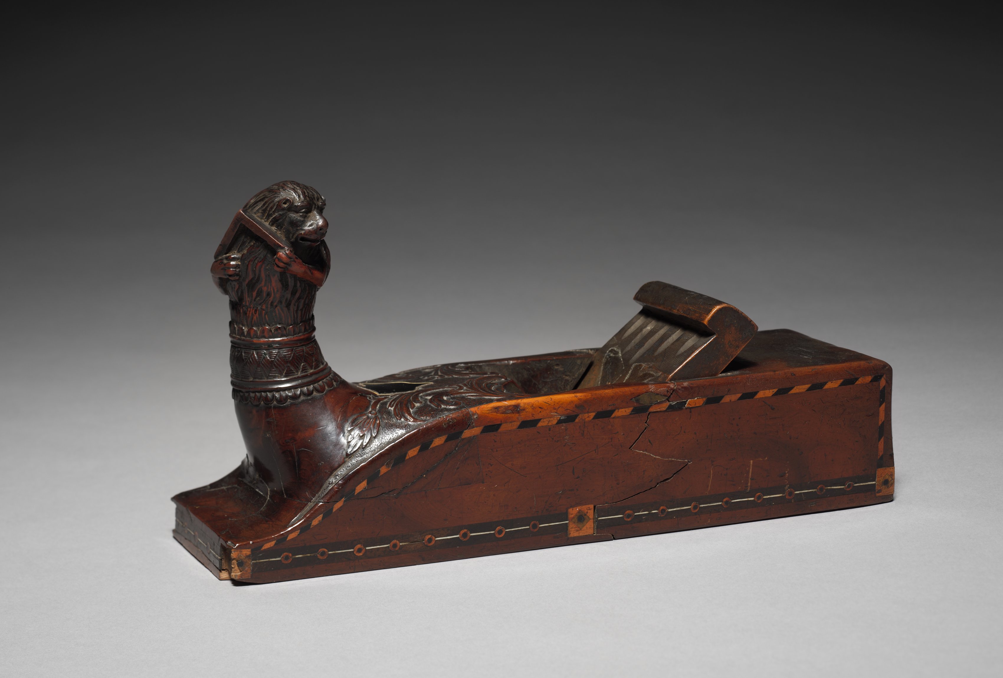 Carpenter's Plane by an unknown artist. The image shows a dark brown wooden tool with a carved monkey or ape head at one end. The head has a long snout and is holding a tool in its mouth. The tool has a flat, rectangular body with a small, curved handle on top and a series of decorative lines and patterns along its length. The body of the tool is adorned with a black and orange border. There are two black bands with circular indentations around the body. The background of the image is a gradient from dark gray at the top to light gray at the bottom.