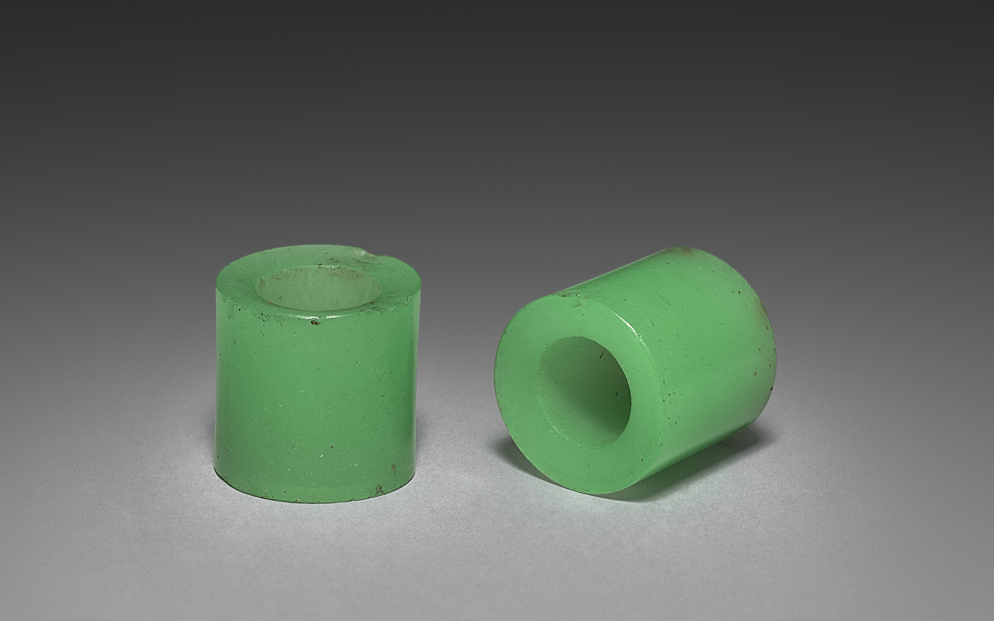 Pair of Earrings by artist. Two cylindrical objects, one standing upright and the other lying on its side, made of green material, likely jade or similar stone, with a smooth surface and small darker speckles scattered throughout, each having a circular hole through its center.