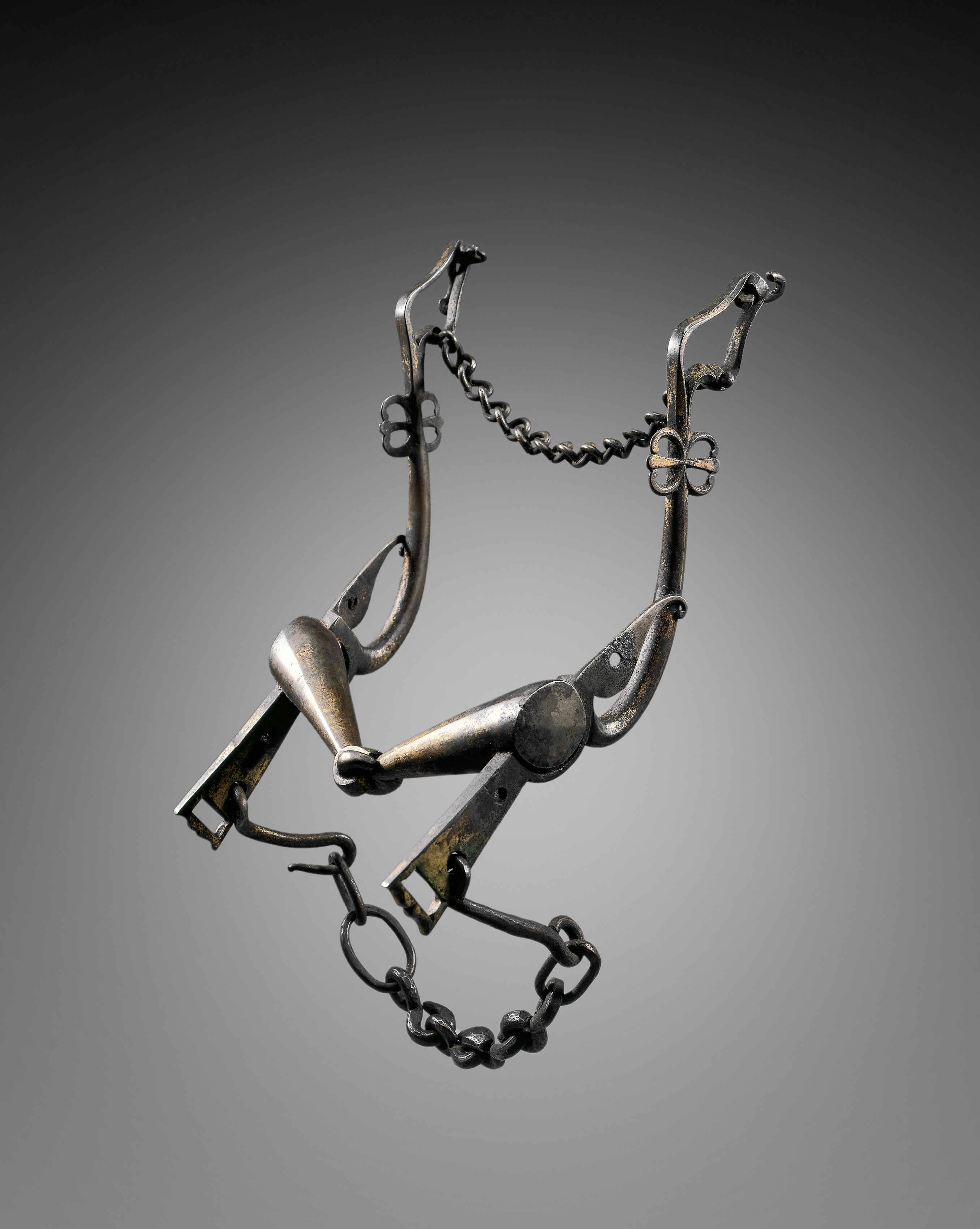 Metal curb bit for horse, Curb Bit. The bit has a curved mouthpiece made of metal with a slight curve, a flat, broad surface where it meets the horse's mouth. Two sidepieces connect to the mouthpiece. The sidepieces have a decorative top with a small hole. The top of the sidepiece curves outward and ends in a decorative flower-like design. The bottom curves inward and attaches to a metal chain. The metal chain is attached to a metal ring below the mouthpiece. The background is gray.