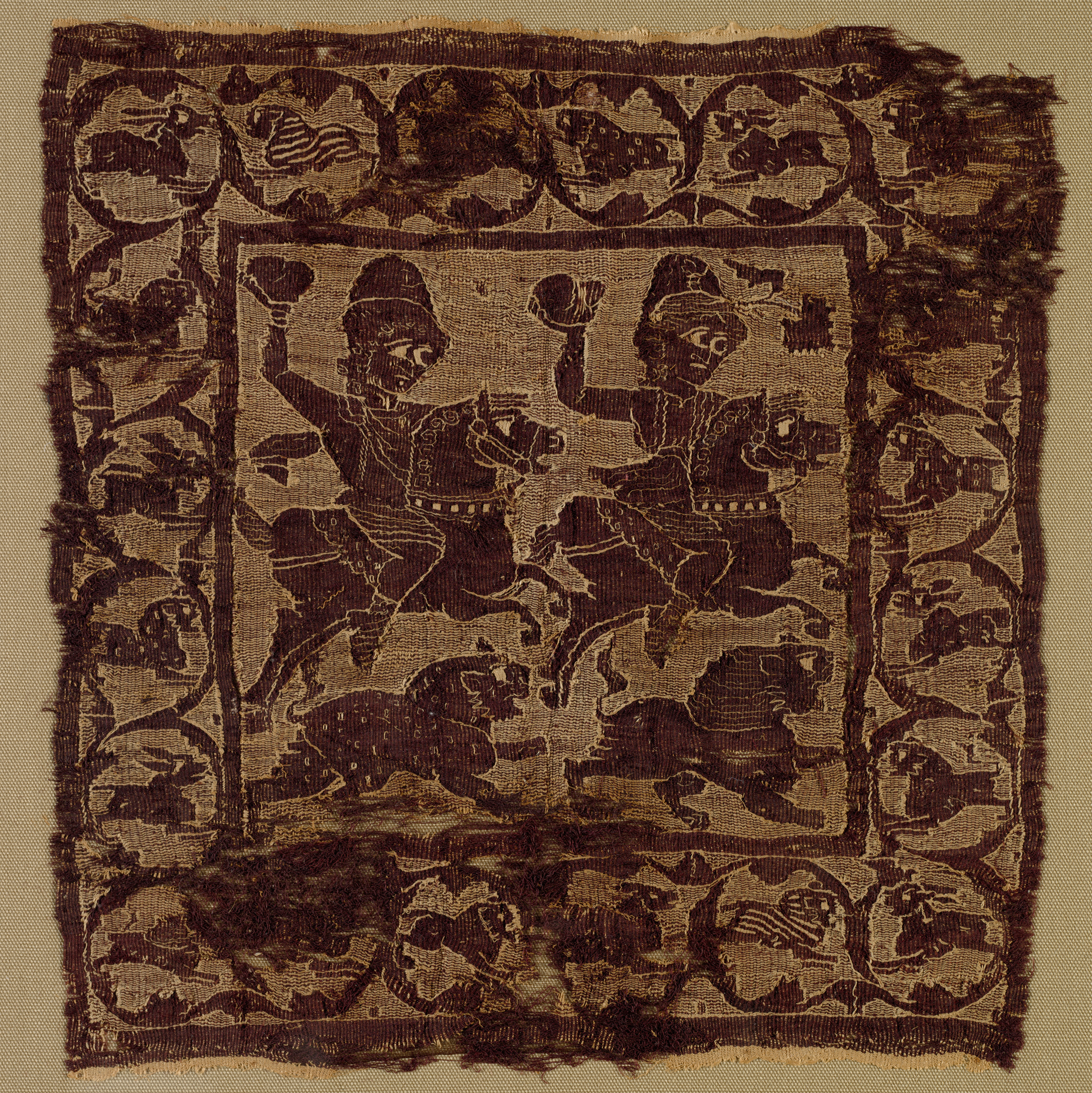 The image depicts a square-shaped ornamental piece with a gold background. The ornamental piece has a dark brown design on a lighter brown background. The design features two horsemen facing each other in the center. The horsemen wear helmets and hold objects in their raised hands. The horsemen ride horses that appear to be rearing up on their hind legs. The central design of the horsemen and horses is surrounded by a border. The border contains a series of connected circular shapes with leaf-like designs. The ornamental piece appears to be made of fabric with a woven texture. The edges of the fabric are rough and frayed. The ornamental piece is titled "Ornamental Square from a Tunic". The artist of the ornamental piece is unspecified.