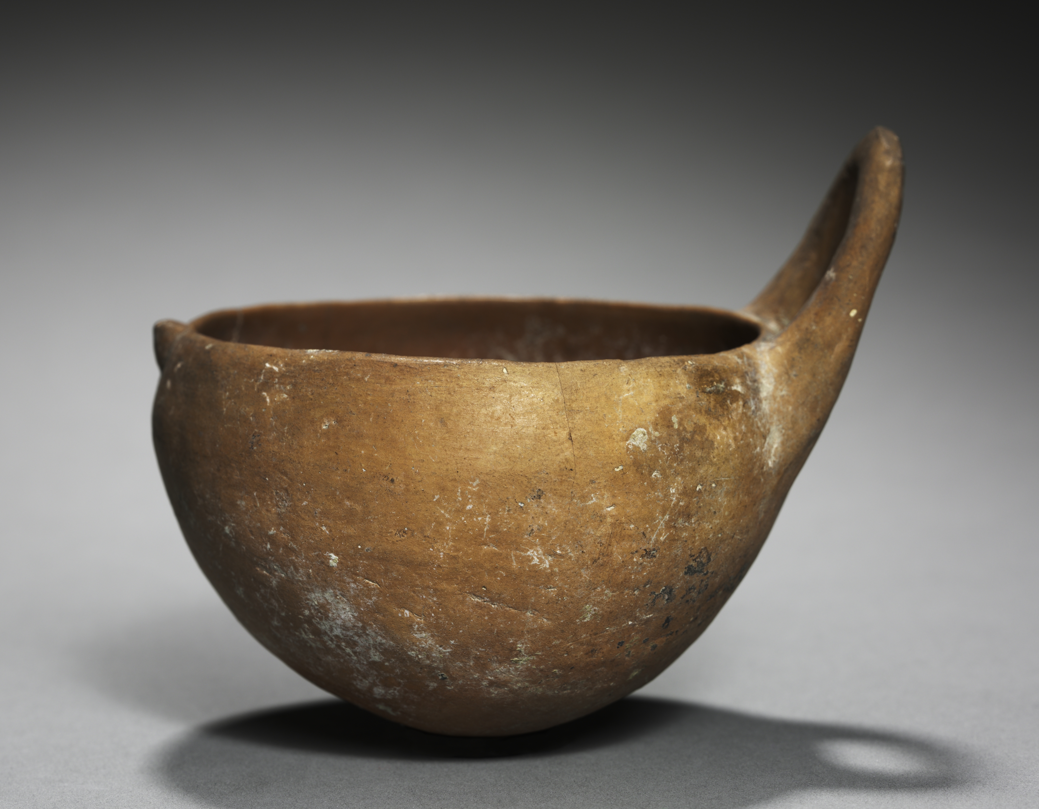 Brown ceramic bowl with one handle; bowl is rounded and made from clay; handle extends from right side; bowl has small chip on left side near rim; surface shows signs of wear and aging; brown color with white and black speckles. One-Handled Bowl by unknown artist.