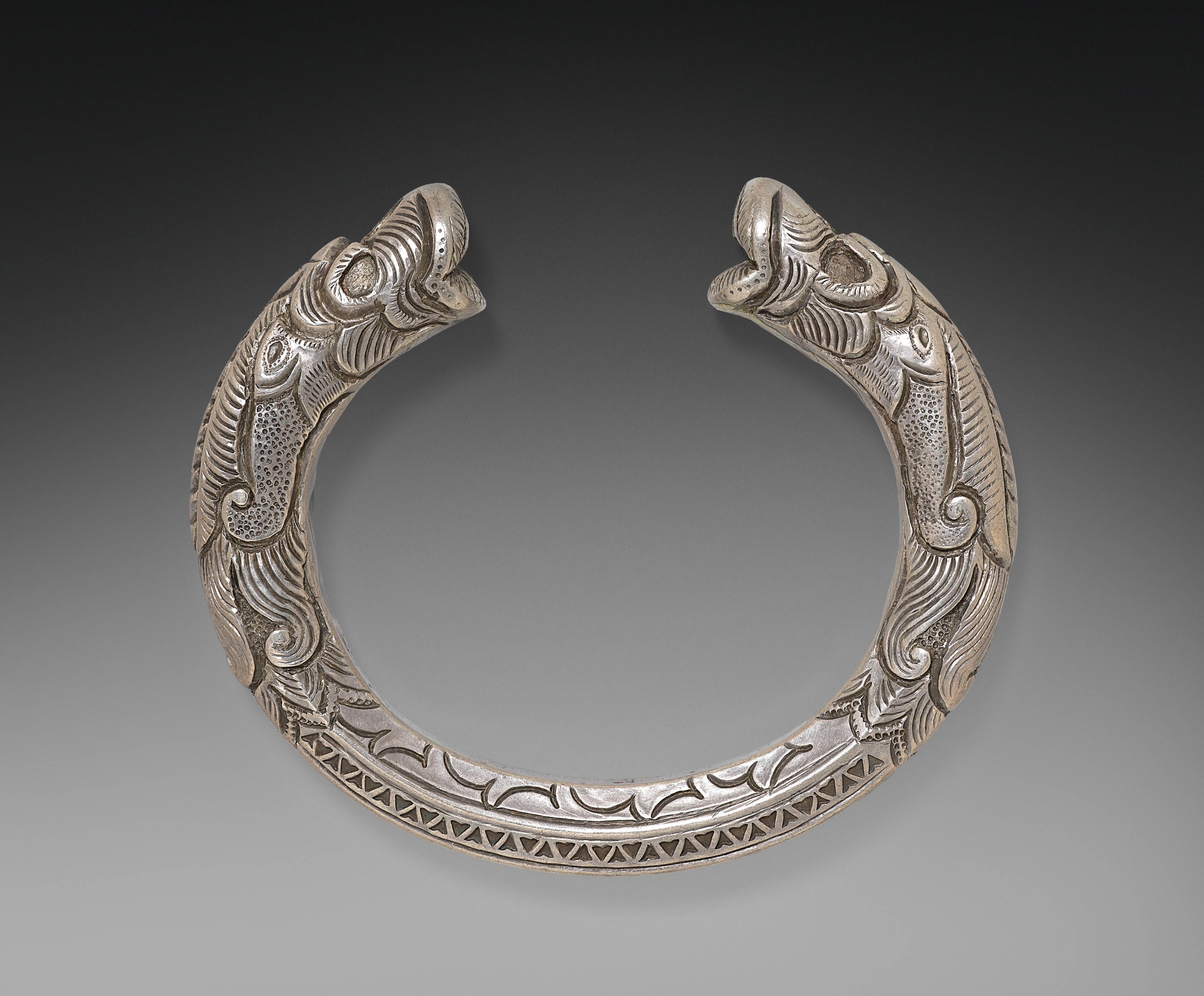 Silver bracelet, thick and rigid, in a C-shape. Two snake-like heads, smooth and rounded, at top; mouths open; small circular eyes; textured scales; curved lines on top and bottom; bottom edge triangular pattern. Gradient background dark gray to light gray.