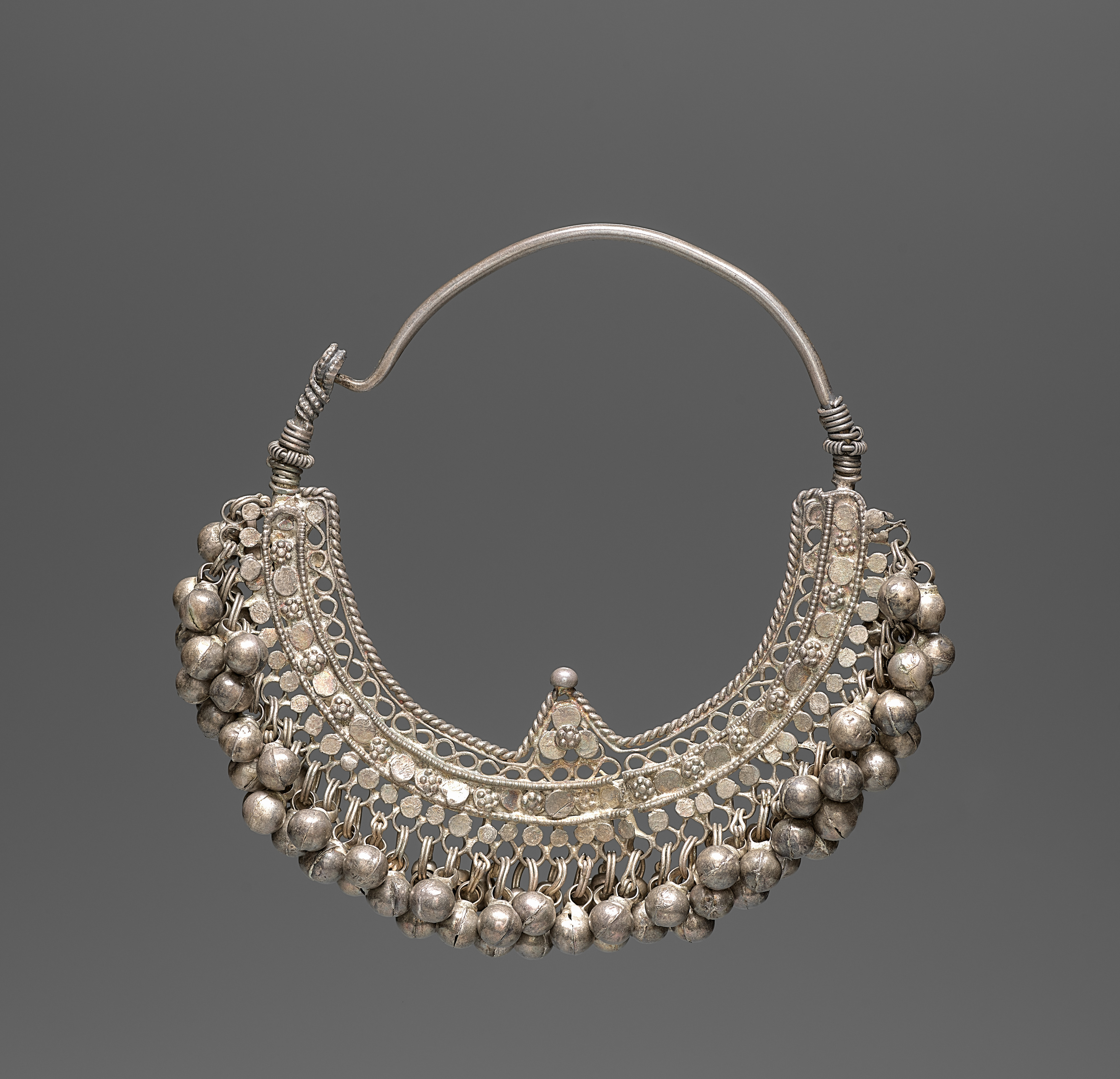 Silver nose ring with a thick, semi-circular shape featuring a hollow design and filigree work. The ring has a textured surface with small balls and circles. Small metal balls are attached along the bottom edge. A thin wire forms the top part, connecting to two small, twisted metal pieces on either side. The background is dark gray. Nose Ring by unknown artist.