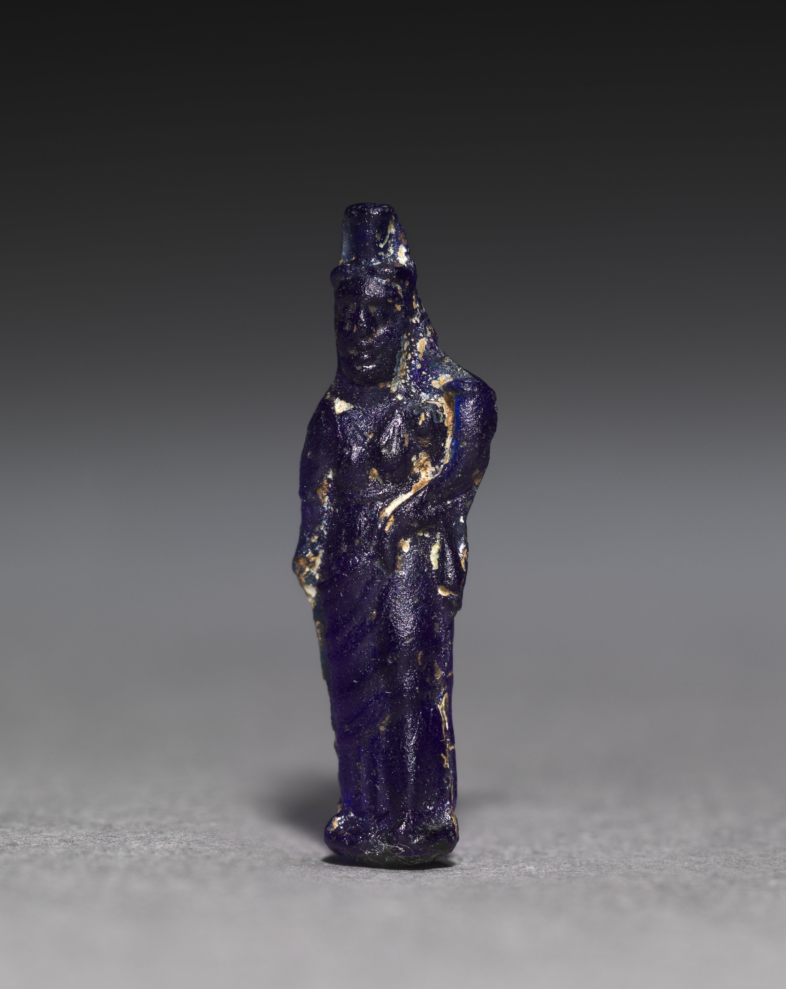 The Amulet of Isis by unknown artist depicts a small, dark blue figurine of a woman with a tall, cylindrical object on her head. The figurine is made of a dark blue material, likely lapis lazuli or another blue stone, and features gold flecks throughout. The woman's face is largely obscured. She wears a long, straight dress that falls to her feet. Her right arm is at her side and her left arm is bent. The background is a gradient from dark gray at the top to light gray at the bottom.