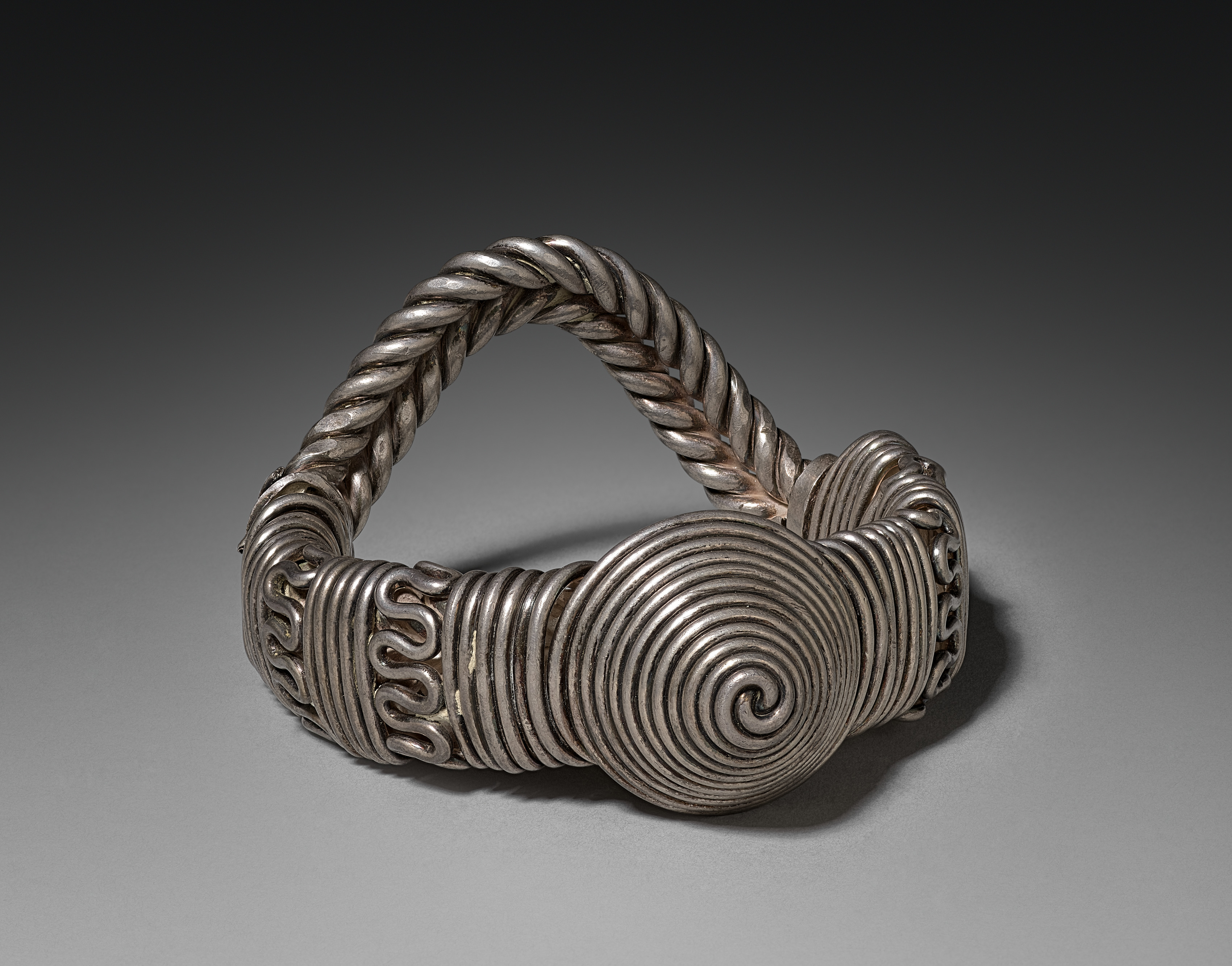Silver armlet with a large spiral design on the front, with twisted rope-like metalwork at the top and scrollwork on the sides. The armlet has a smooth gray background. The armlet, titled "Armlet", is by an unknown artist.