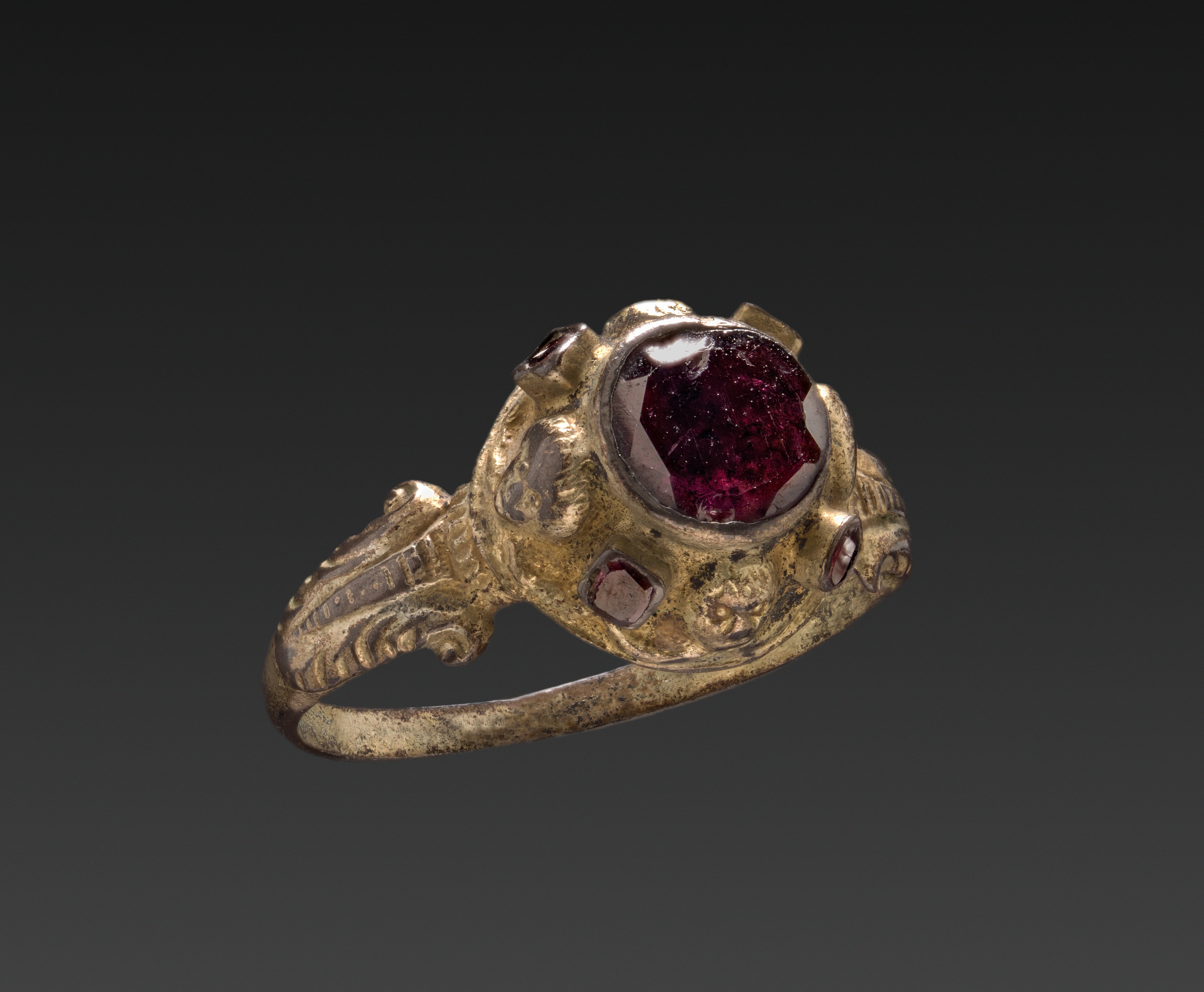 Gold ring with a large, round, dark red gemstone set in the center. The gemstone is surrounded by a decorative gold setting with small, raised bumps around the edge. Three smaller, dark red gemstones are set into the gold on either side of the large gemstone. The band of the ring is gold with an ornate design. The background is dark gray and black. The Ring by artist is not identified but the ring appears to be a piece of jewelry titled "Ring".