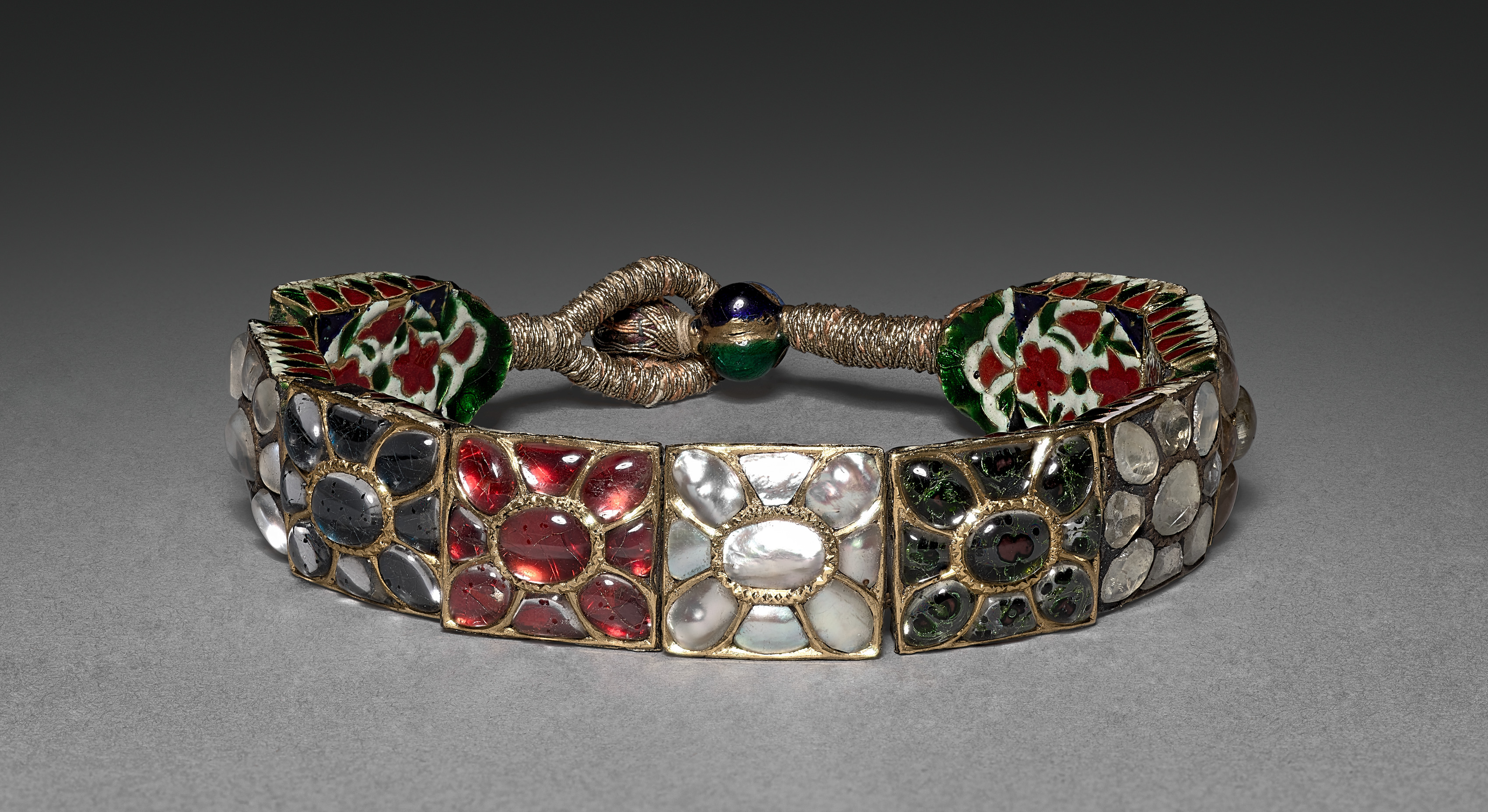 Gold bracelet with a loop and knotted closure, featuring a repeating design of three sections of inset gems set into gold. The gems are predominantly red, clear, and green. The bracelet has a rounded shape and tapers to form two cylindrical shapes on either side. The cylindrical shapes are enameled with white, red, green and blue on a white background. A dark blue and green bead are on either side of the loop closure.