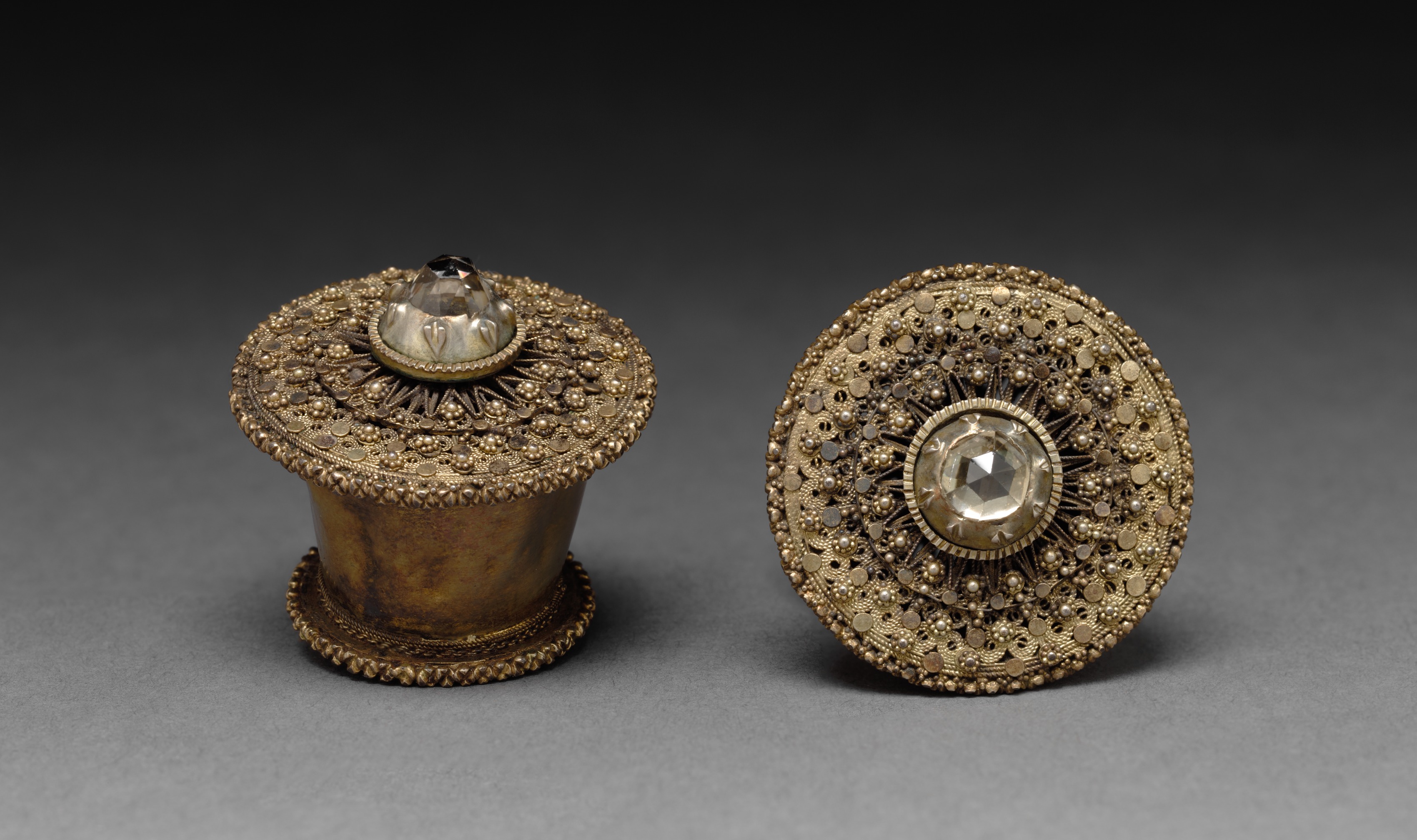 The image shows a pair of earrings. The earrings are gold-colored, with intricate designs and a large clear gemstone in the center of each. The earring on the left is cylindrical in shape, with a flat top and bottom; the top is decorated with a pattern of small beads and filigree, and a large clear gemstone sits in the center. The earring on the right is circular and flat, with a similar design to the other earring; it also features a large clear gemstone in the center. Both earrings have a ornate, antique appearance. The background of the image is a gradient from dark gray at the top to light gray at the bottom.