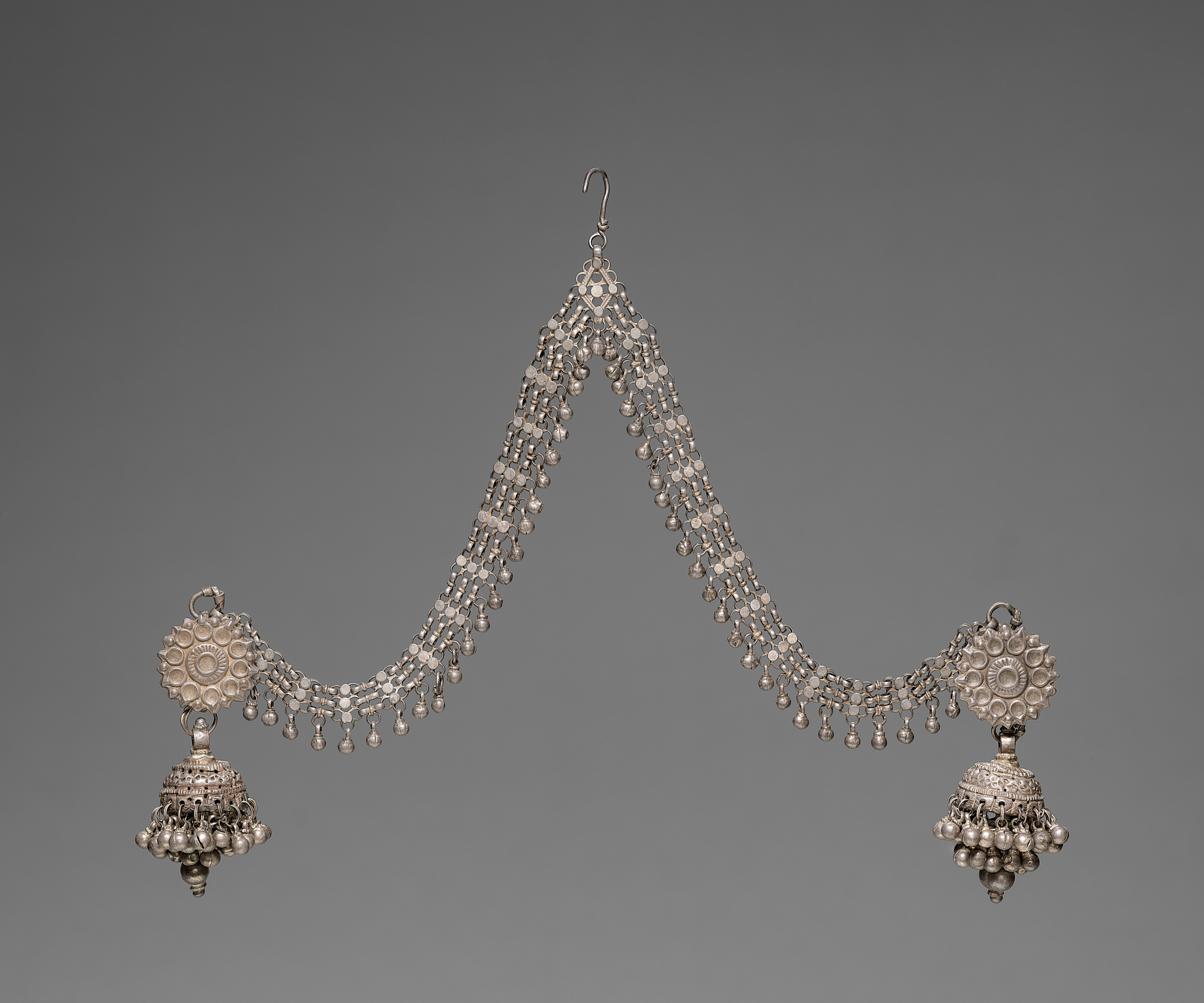 Silver necklace and earrings. The necklace has a hook at the top and chains of multiple strands with a large medallion at each end. There are teardrop-shaped beads hanging from the sides. Each end of the necklace has a large earring; the top of each earring is a floral-shaped disk; a dome-shaped piece with metal balls around it hangs from each. The background is gray. The artist is "Ear Studs and Chains".