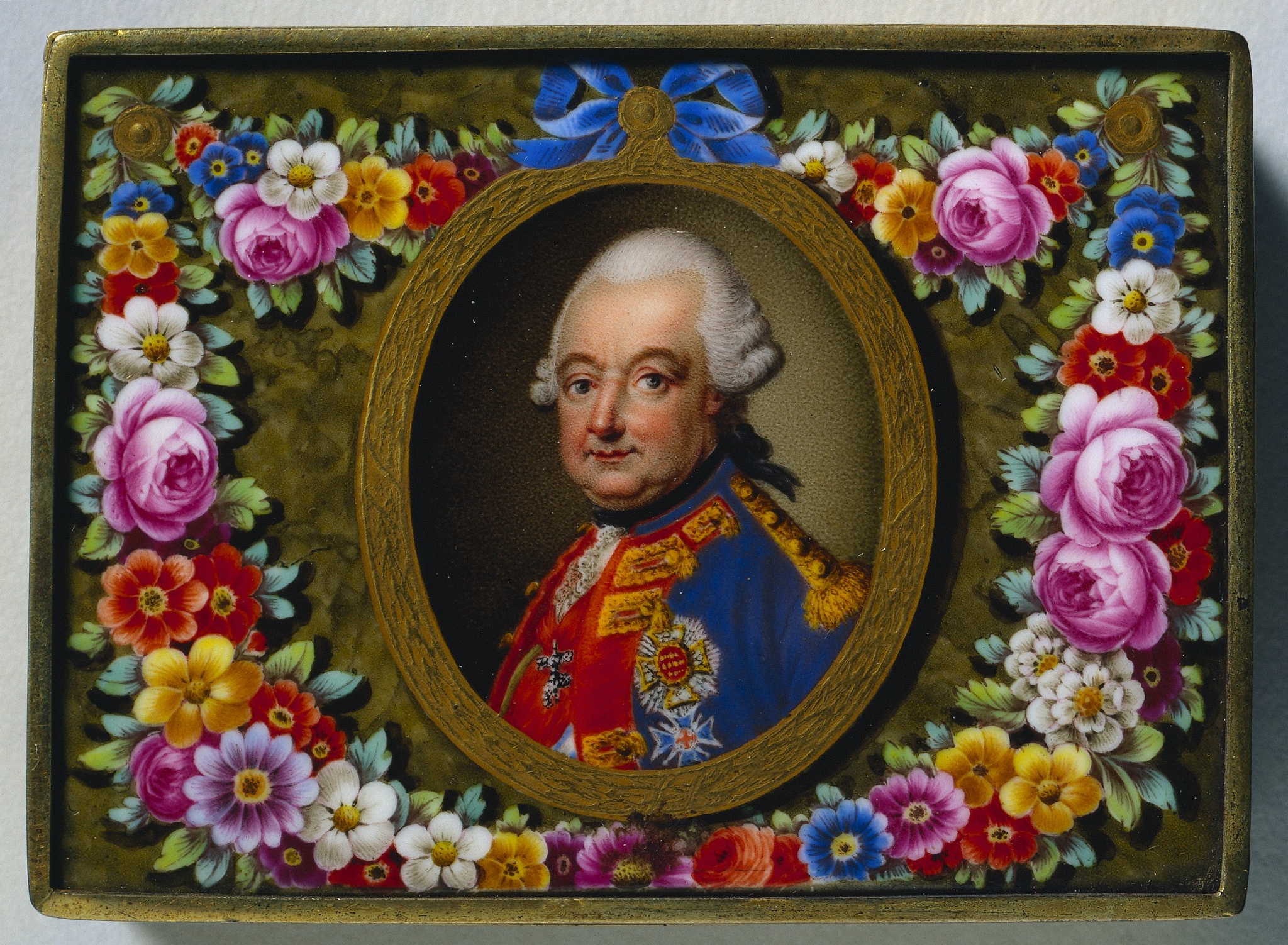 Rectangular box with rounded corners and a gold border. The box has a portrait in the center. The portrait is in an oval gold frame and depicts a man with white hair wearing a blue military-style jacket with gold accents and a red sash. He is surrounded by a border of colorful flowers in shades of pink, red, yellow, blue, and white. A blue bow is at the top center. The box's background is gold with a subtle pattern.
