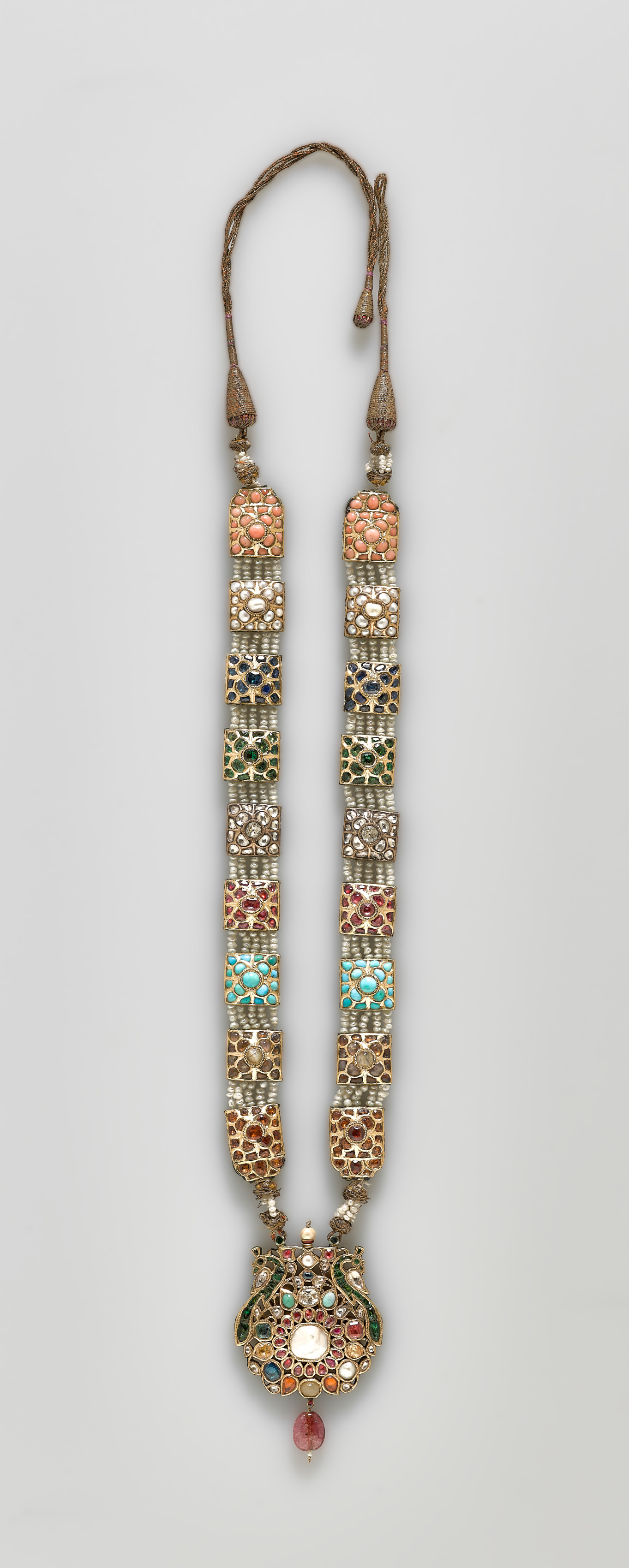 Jeweled Necklace and Pendant by unknown artist. Long necklace with a corded brown string and tassel ends. Necklace has a pendant at the bottom. The pendant is teardrop shaped with a pink gemstone hanging from the bottom, and it has multicolored stones. The stones on the pendant and the necklace include pink, green, blue, orange, and white. The necklace has a repeating pattern with a row of small white beads above and below each row of multicolored stones. The background of the image is white.