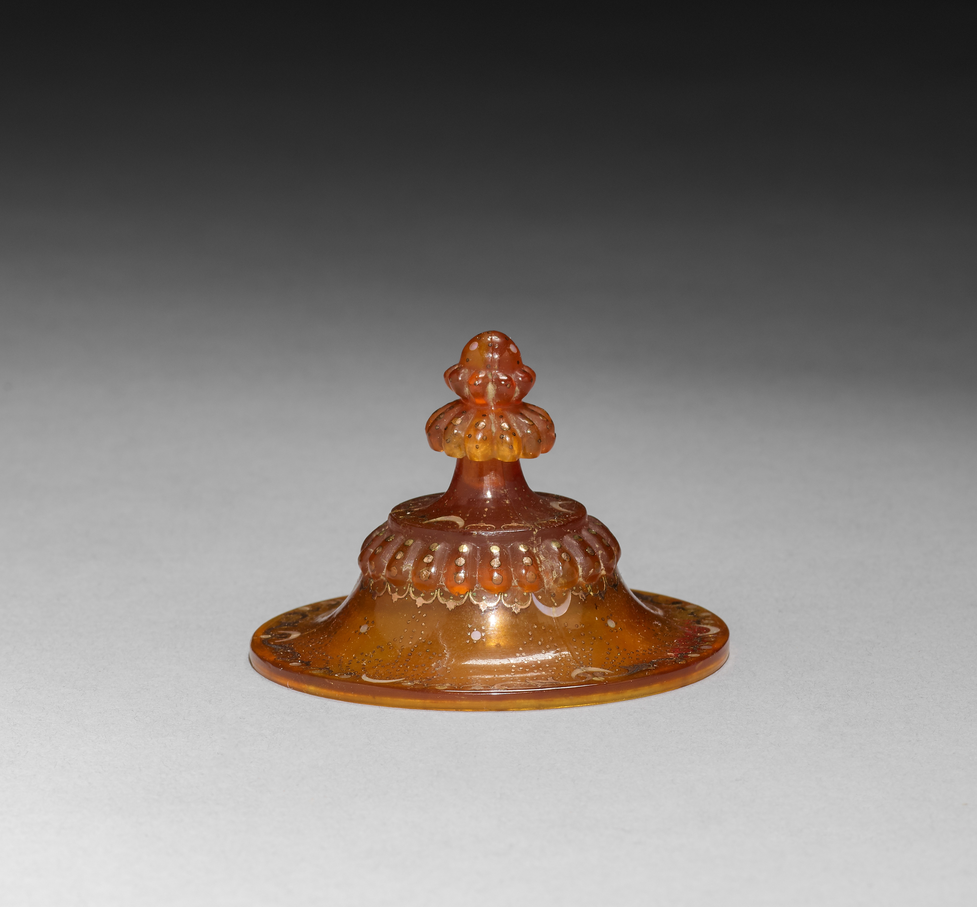Brown glass object with a wide base and narrow stem; rounded knob on top; object has a domed shape; shiny surface; white and gold spots on surface.