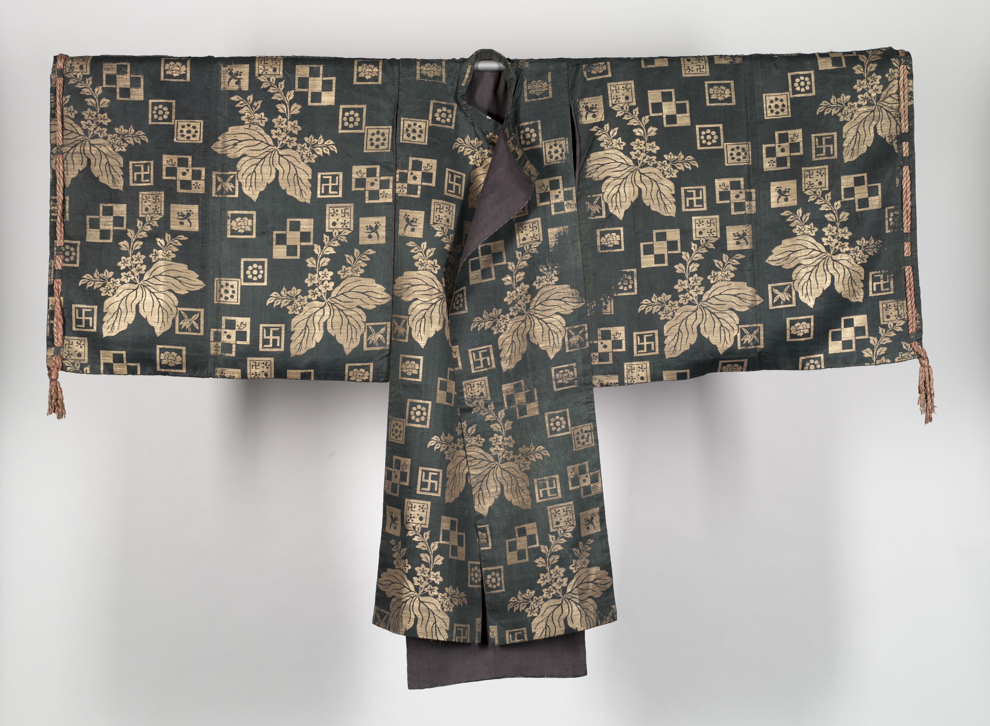 Dark green garment with wide sleeves and long sash; fabric features large beige leaves and flowers on a background of geometric patterns; beige tassels hanging from either end; long sash pulled through loop at neck. Noh Robe (Kariginu).