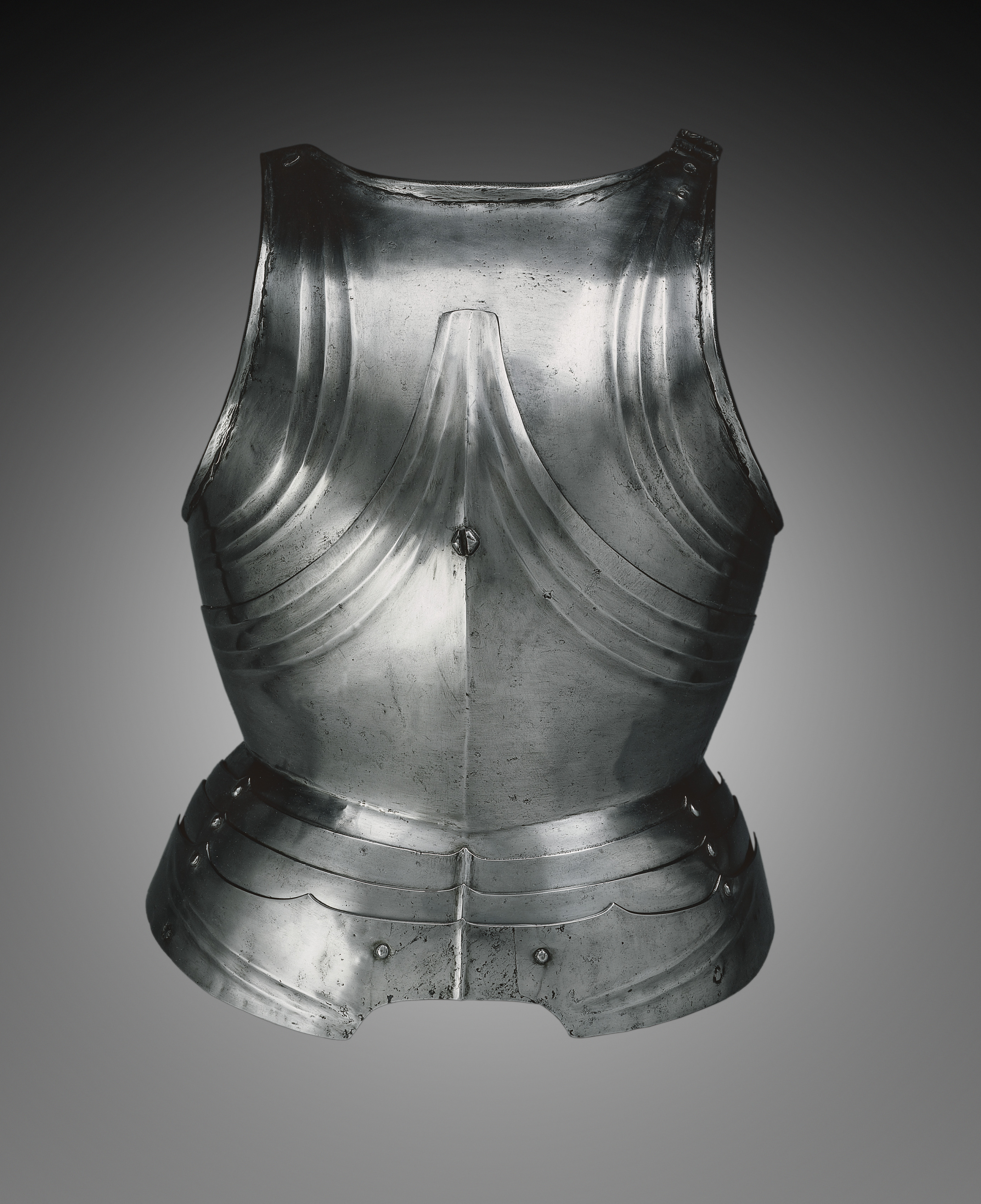 The Gothic Breastplate by Hans Stopler features a curved, silver-colored metal piece with a wide top and narrower bottom. The top has a rounded, wide scoop neckline and slightly curved shoulders. The piece is adorned with multiple horizontal grooves running across it. A central vertical groove runs down the middle, accompanied by a small circular indentation. The bottom section is wider and has a more pronounced curve, with a series of small rivets along the edges. The background transitions from dark gray at the top to light gray at the bottom.