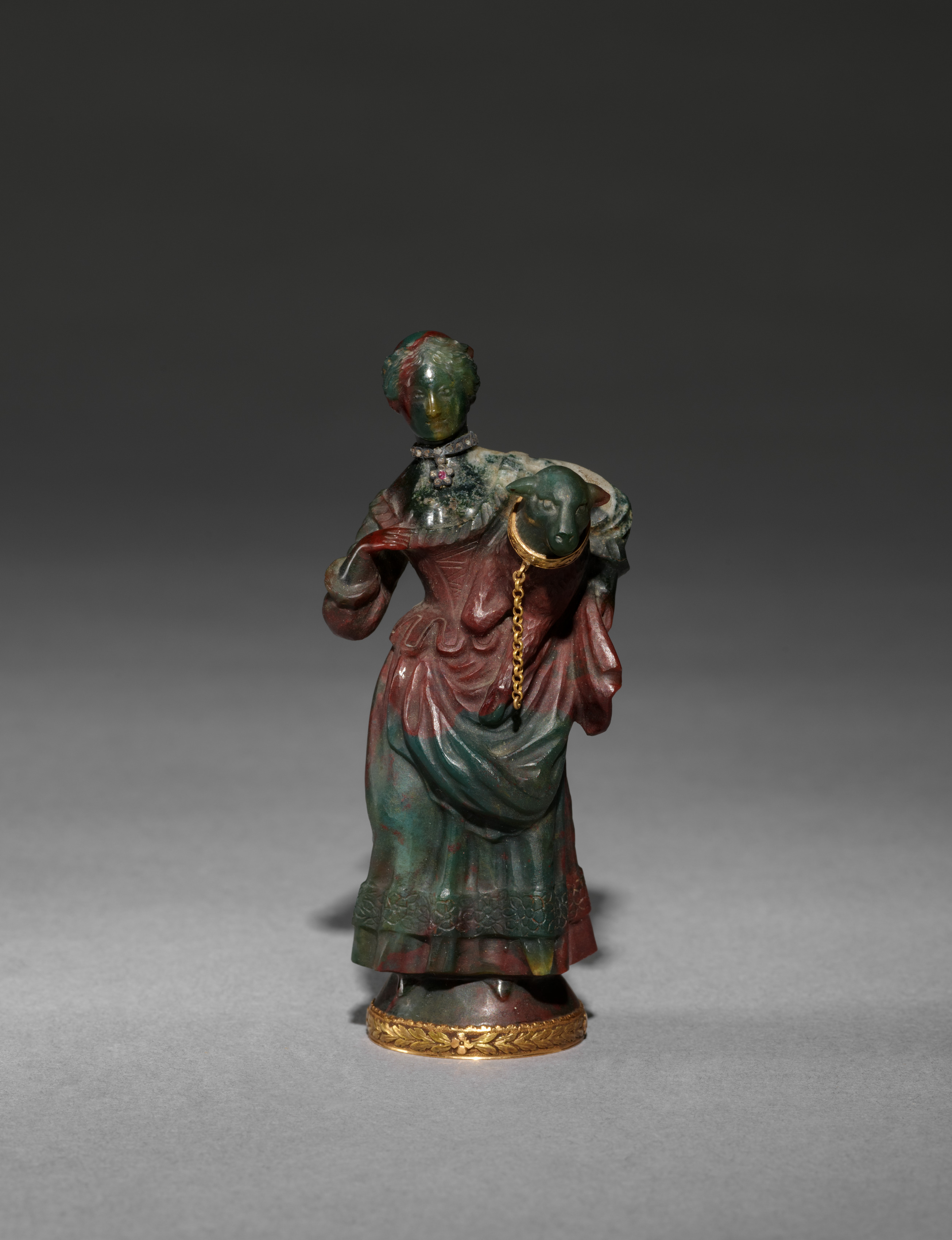 Green and red sculpture of a woman with a lamb. The woman wears a long dress. The sculpture is on a gold base. The woman has her right arm bent upwards, and her left arm supports a lamb with a gold chain around its neck. The background is dark gray.