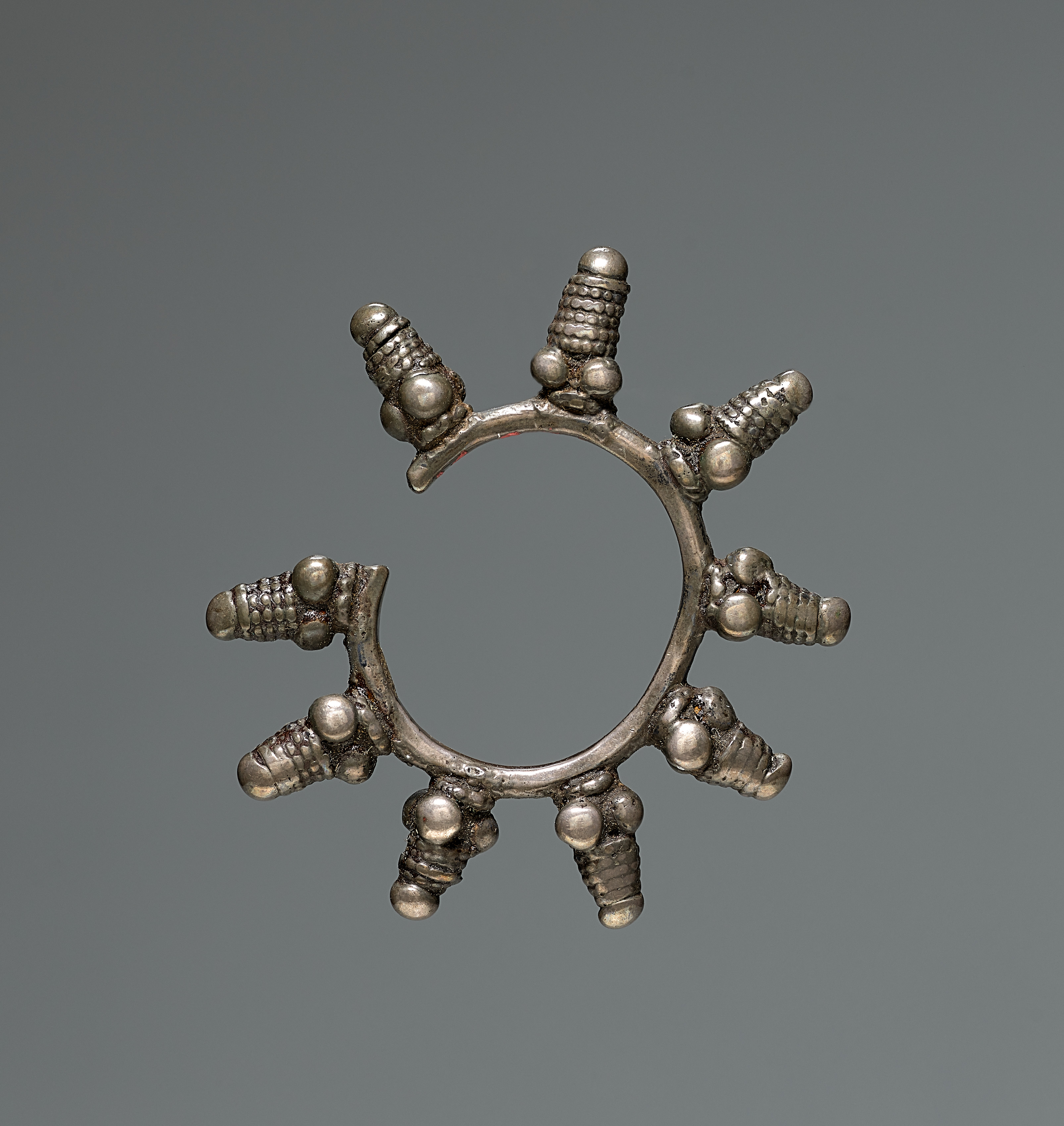 Circular metal object with protrusions; gray background. The object is a earring by artist unknown. It is made of metal, appears to be silver or gray in color. The earring has a circular base. There are six protrusions, each resembling a small cylinder with a rounded top and bottom. Each protrusion is wrapped with small metal rings. Small metal balls are positioned between protrusions. The background of the image is solid gray color.