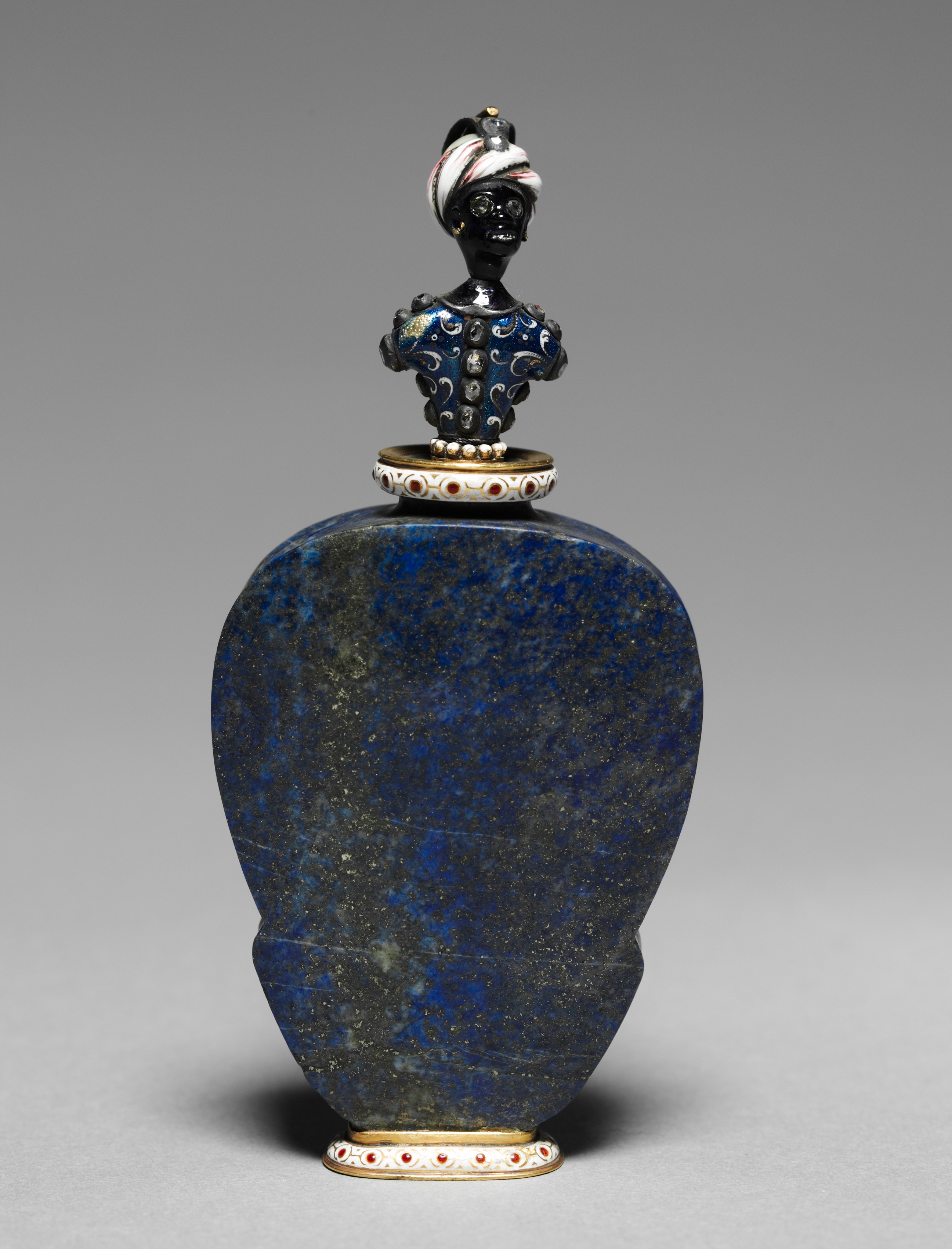 Dark blue stone scent bottle with rounded rectangular body, small neck, and rounded shoulder. White and red metal bands around neck and base. Stoppers features black bust of woman with white headwrap.