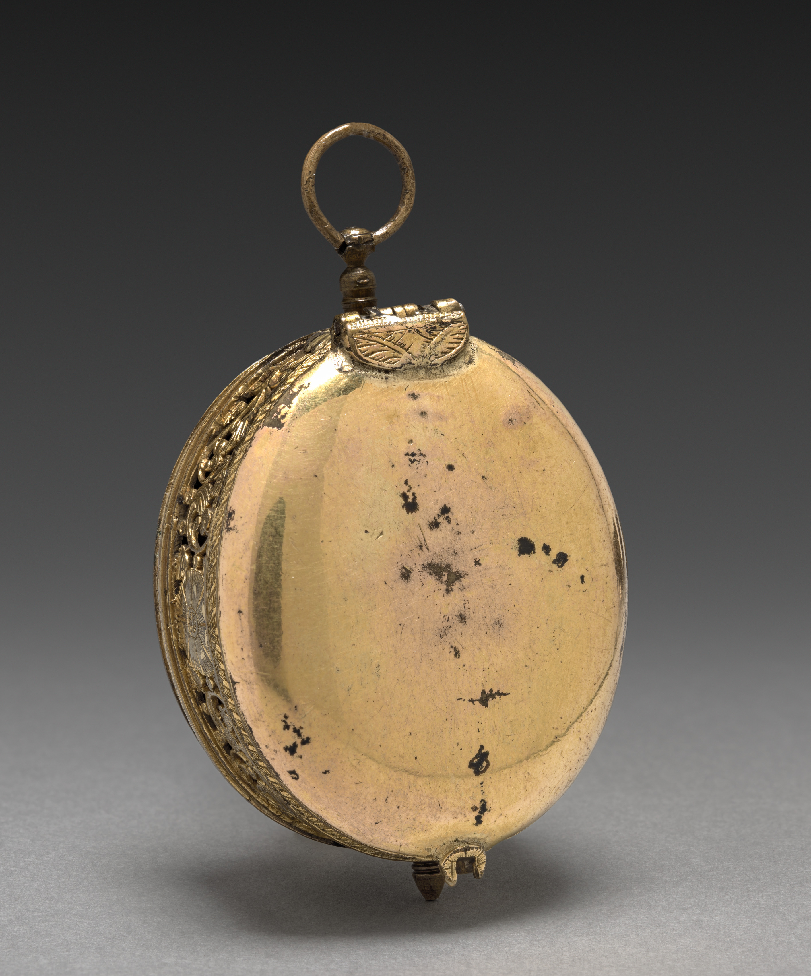 Gold pocket watch with a round body and a small loop at the top for attachment. The watch is slightly oval and has a small protrusion on the bottom center for stability. Black spots are visible on the surface. The left side shows ornate designs. The background transitions from dark to light gray. Watch by Waltham.