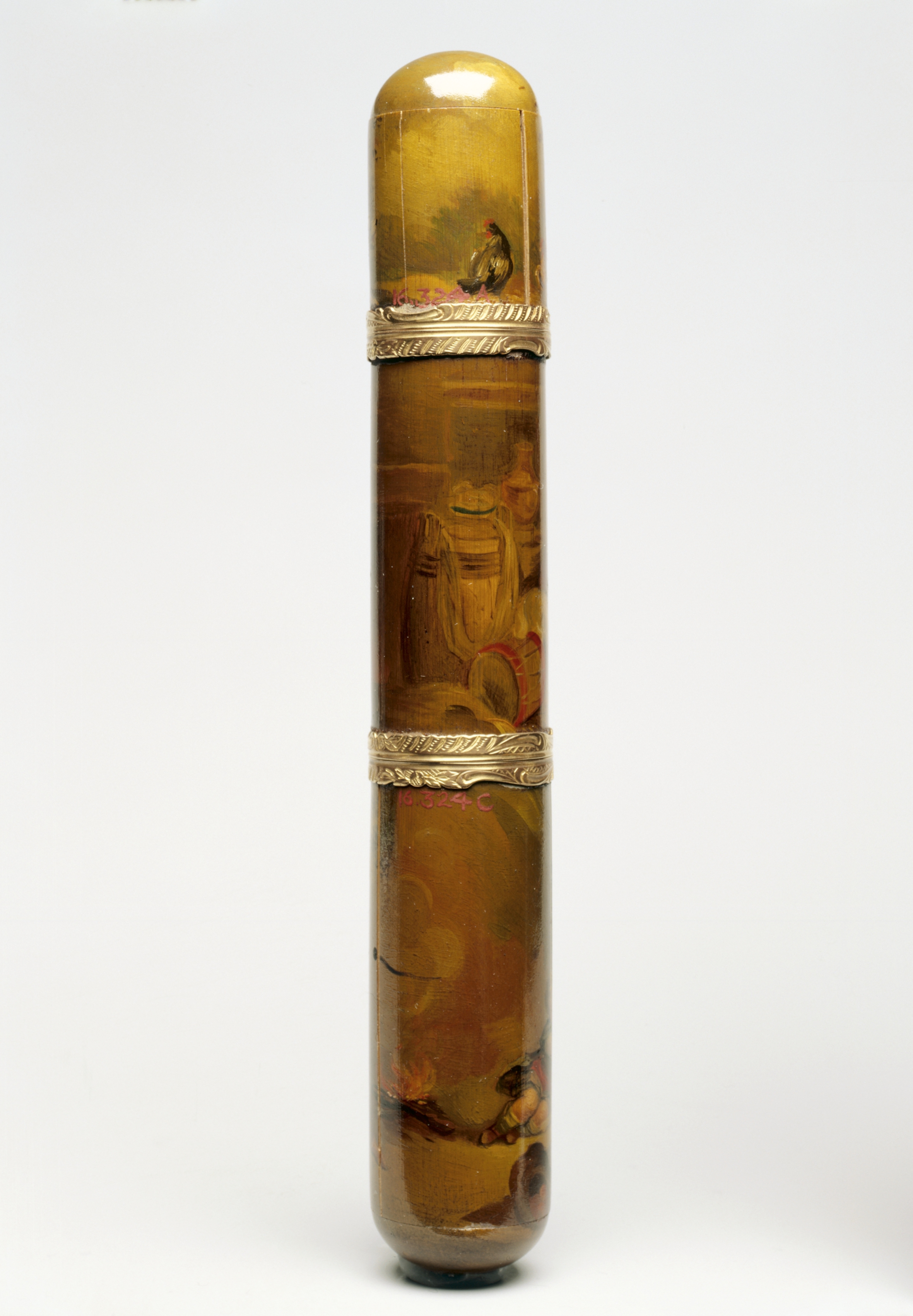 The Perfume Case (Etui flaconnier) by René Lalique is a tall, cylindrical object with a rounded top. The object is primarily amber-colored with a glossy finish. It features two gold bands around its middle and near the top. The surface of the object appears to have a painted design, depicting what seems to be a scenic view or figures, although the details are not clear. The background of the image is plain and light-colored.