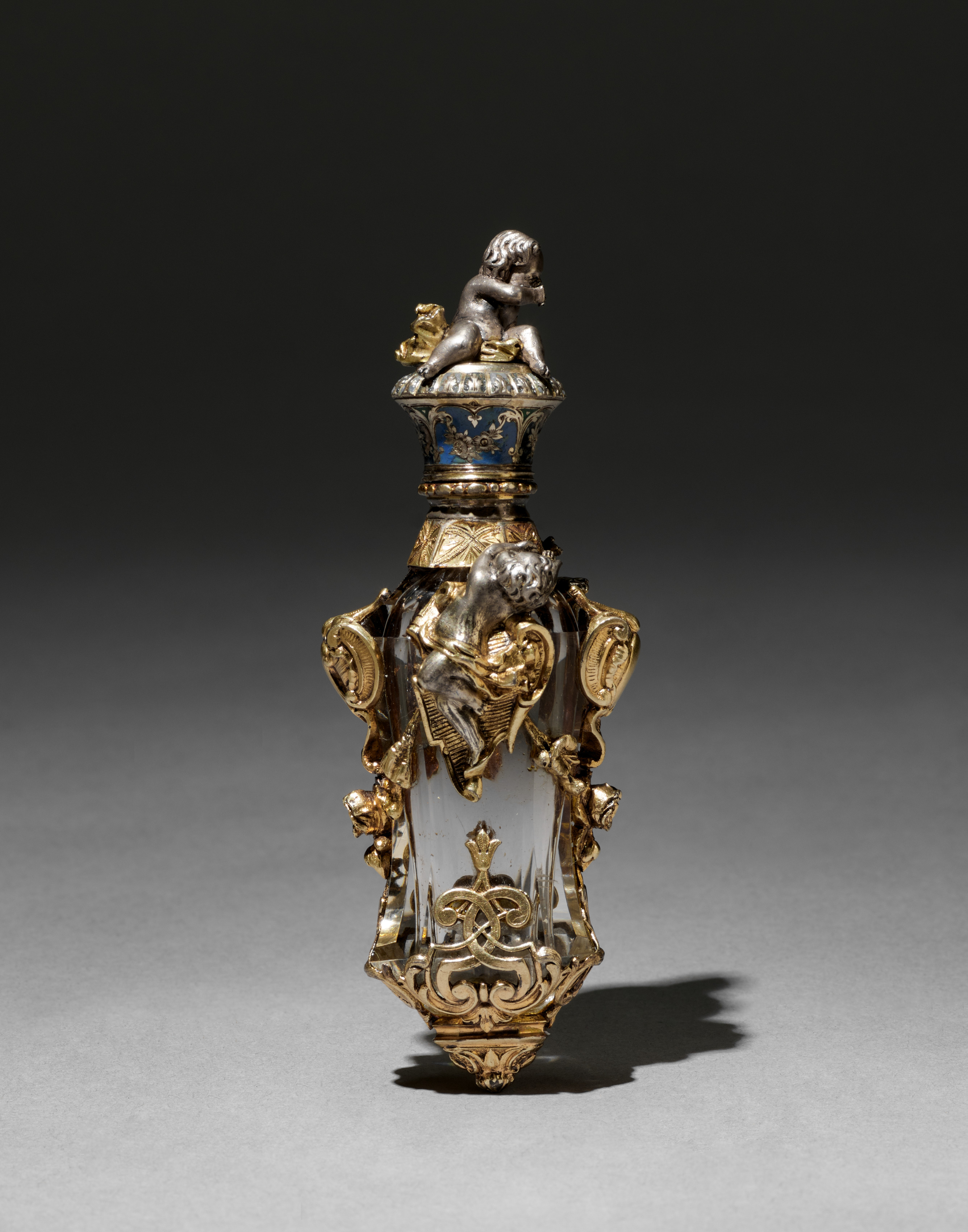 The Scent Bottle by René Lalique features a clear glass body adorned with a gold metal framework. The framework is ornate, with intricate designs covering the lower and middle sections. Two cherubs, one silver and one gold, are positioned on the lid. The bottle has a rounded base and a narrow neck. A blue and gold band encircles the top of the bottle, just below the lid. The background is dark at the top, transitioning to light gray towards the bottom.