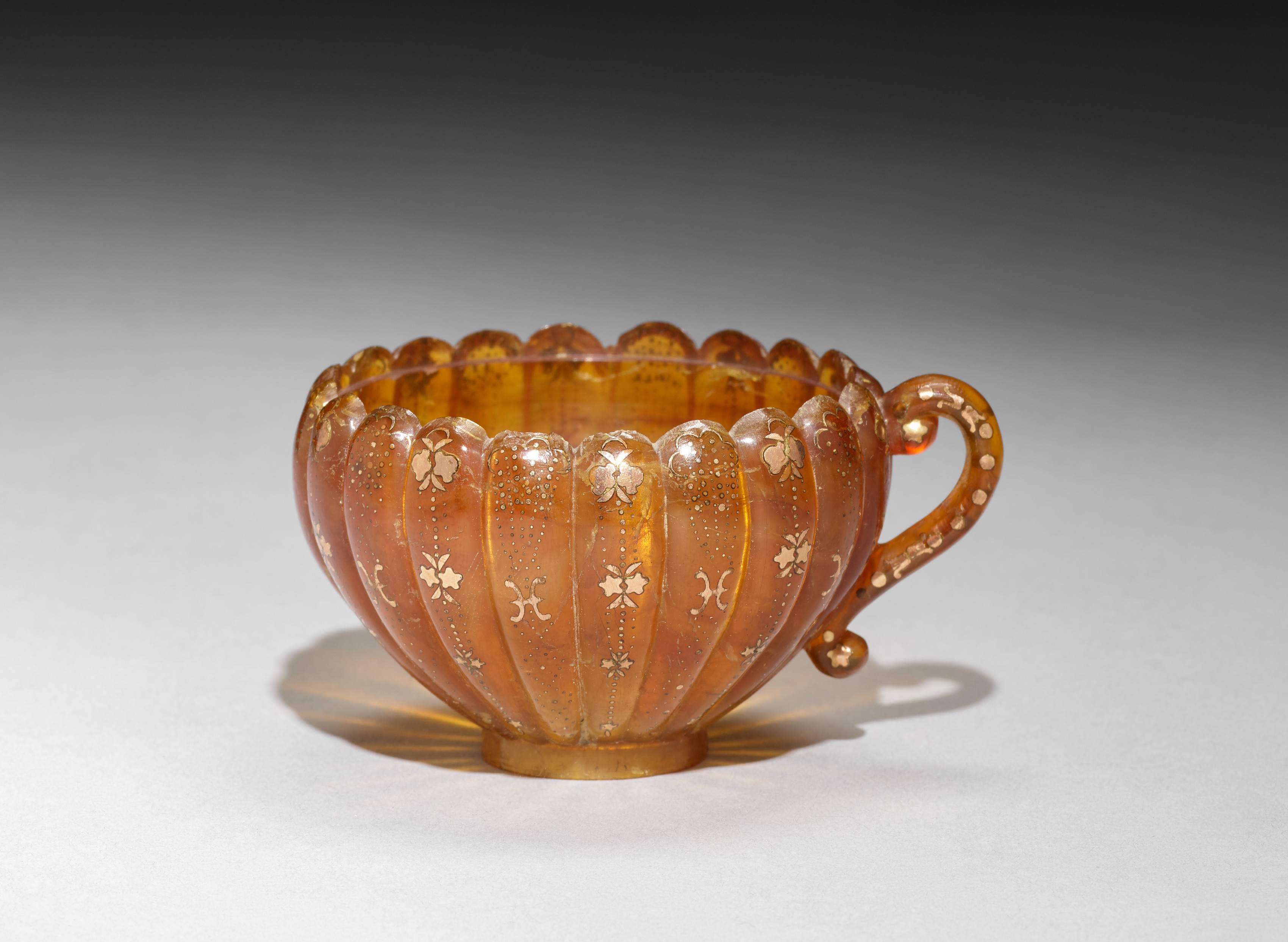 Amber-colored cup with a ribbed exterior and scalloped rim. Handle on right side. Gold floral inlays on exterior. Slightly translucent.