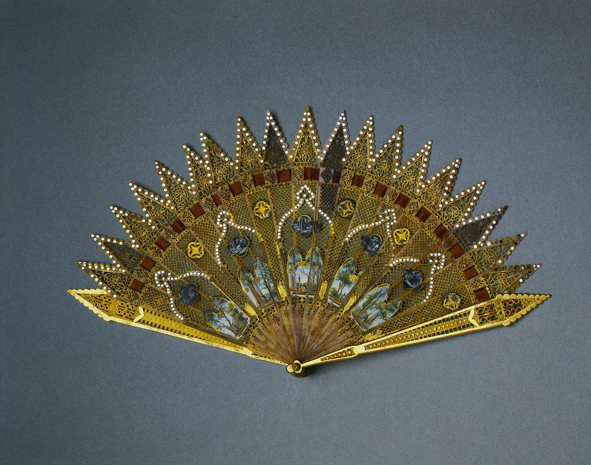 Brise fan: Gothic Revival Style by artist: A gold-colored, open fan with a gothic revival style design. The fan is shaped like a half-circle with a straight edge at the bottom. The fan has a repeating pattern of gold-colored metal filigree with white dots around the edges. There are several brown rectangular pieces on the fan, alternating with the filigree. The center of the fan has several painted scenes. The fan has two long, thin handles that are gold-colored with a scalloped edge. The background is a dark gray color.
