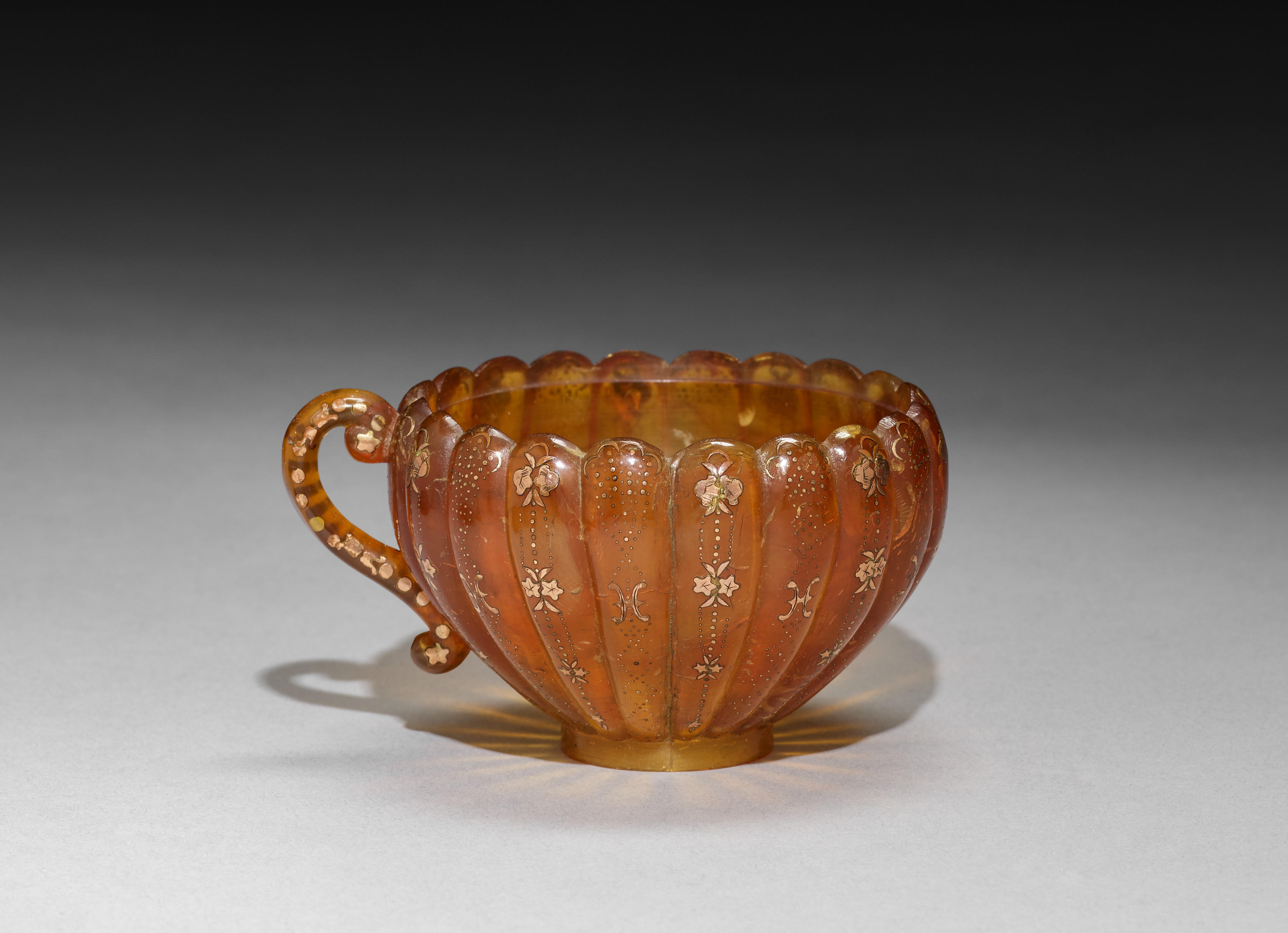 Orange-red translucent glass cup with a ribbed exterior. The cup has a rounded body with a flared mouth and a short stem base. A curved handle is attached to the left side, featuring small circular protrusions. The exterior of the cup is decorated with etched floral patterns and gold accents. The background is a gradient from dark at the top to light at the bottom. The artist is René Lalique. The title is "Cup".