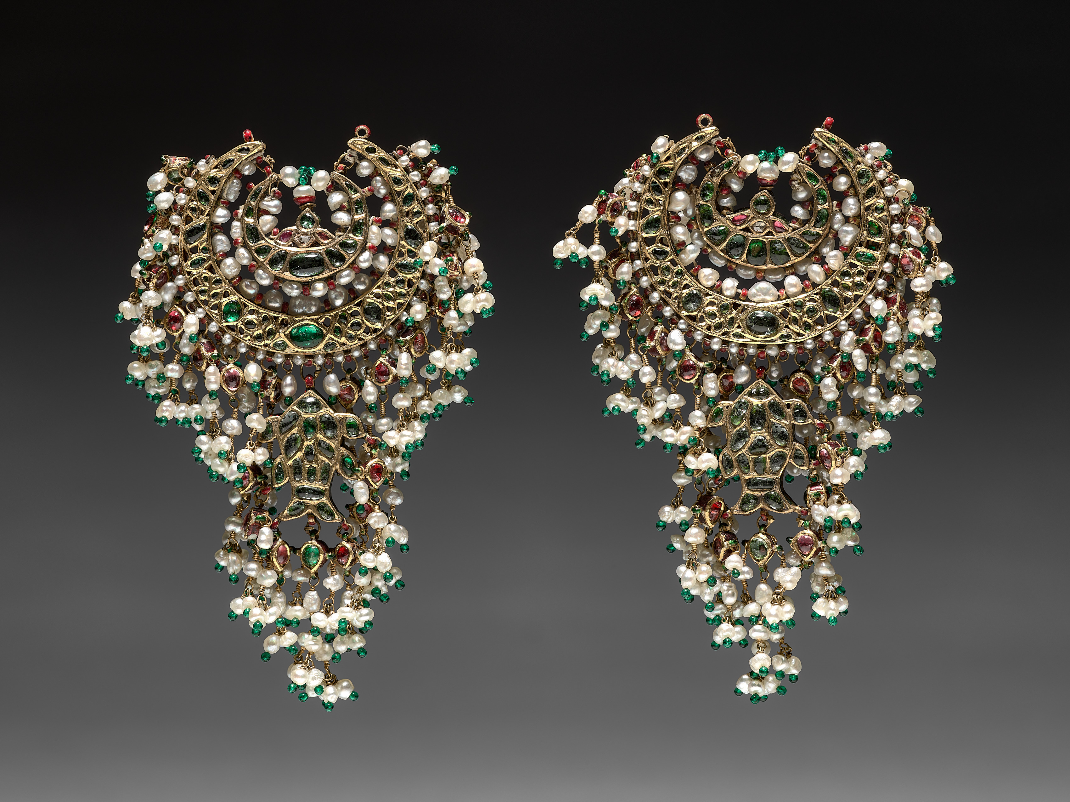 The pendants are gold with intricate designs. They have a teardrop shape and are adorned with numerous small pearls, emeralds, and rubies. The pearls are white and spherical, while the emeralds are green and the rubies are red. The gold framework is filigree-style, with a web-like pattern that supports the gemstones. The background is dark gray to black, transitioning from light at the bottom to dark at the top.
