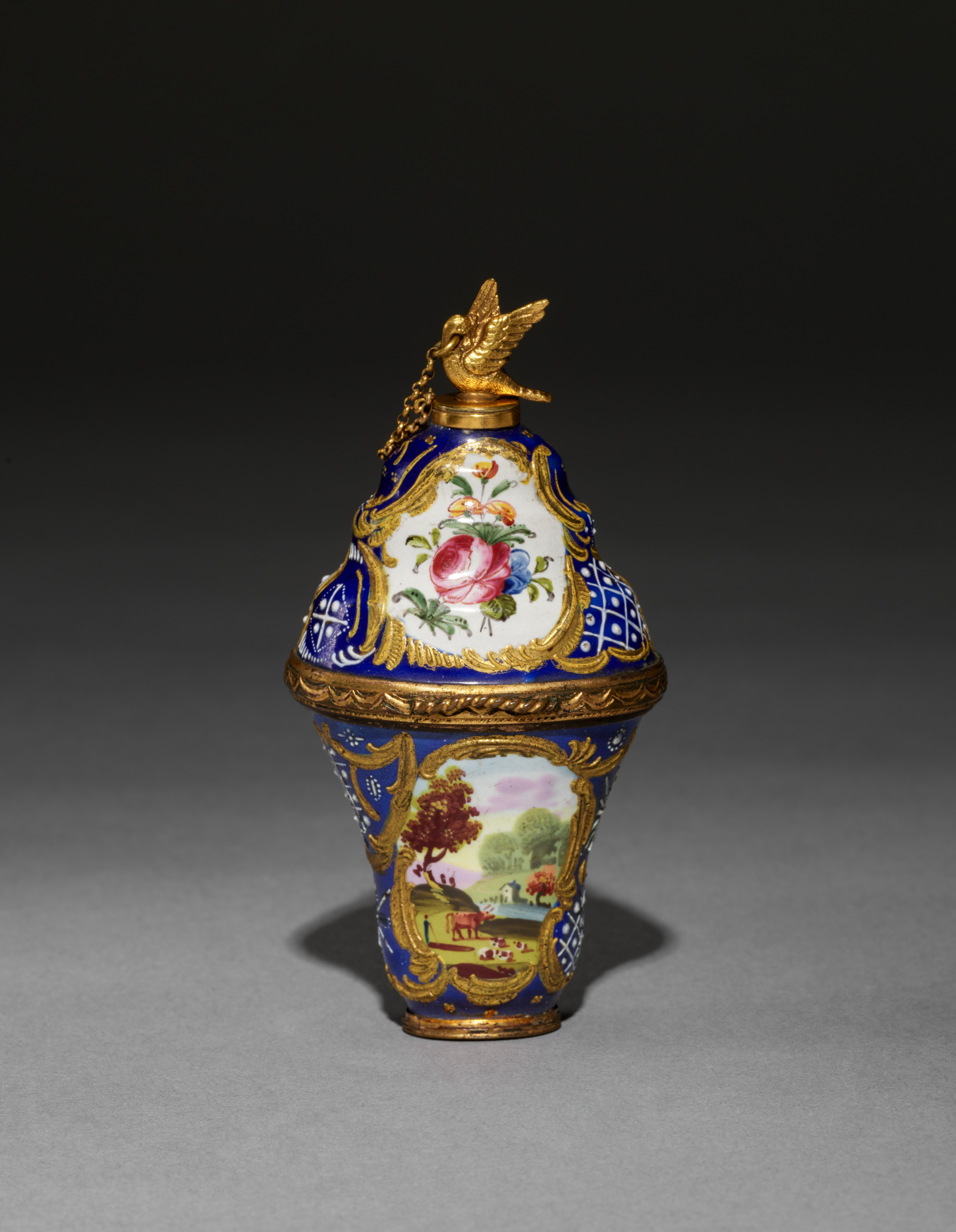A closed scent bottle with a gold bird on top, blue, white, and gold body with floral and scene panels; sits on a box. The scent bottle is blue and white with gold trim. The top portion of the scent bottle is rounded. A floral panel on the top half, with gold trim and blue background. A scene panel on the bottom half, depicting a landscape with trees and a body of water. The box is rectangular and flat.
