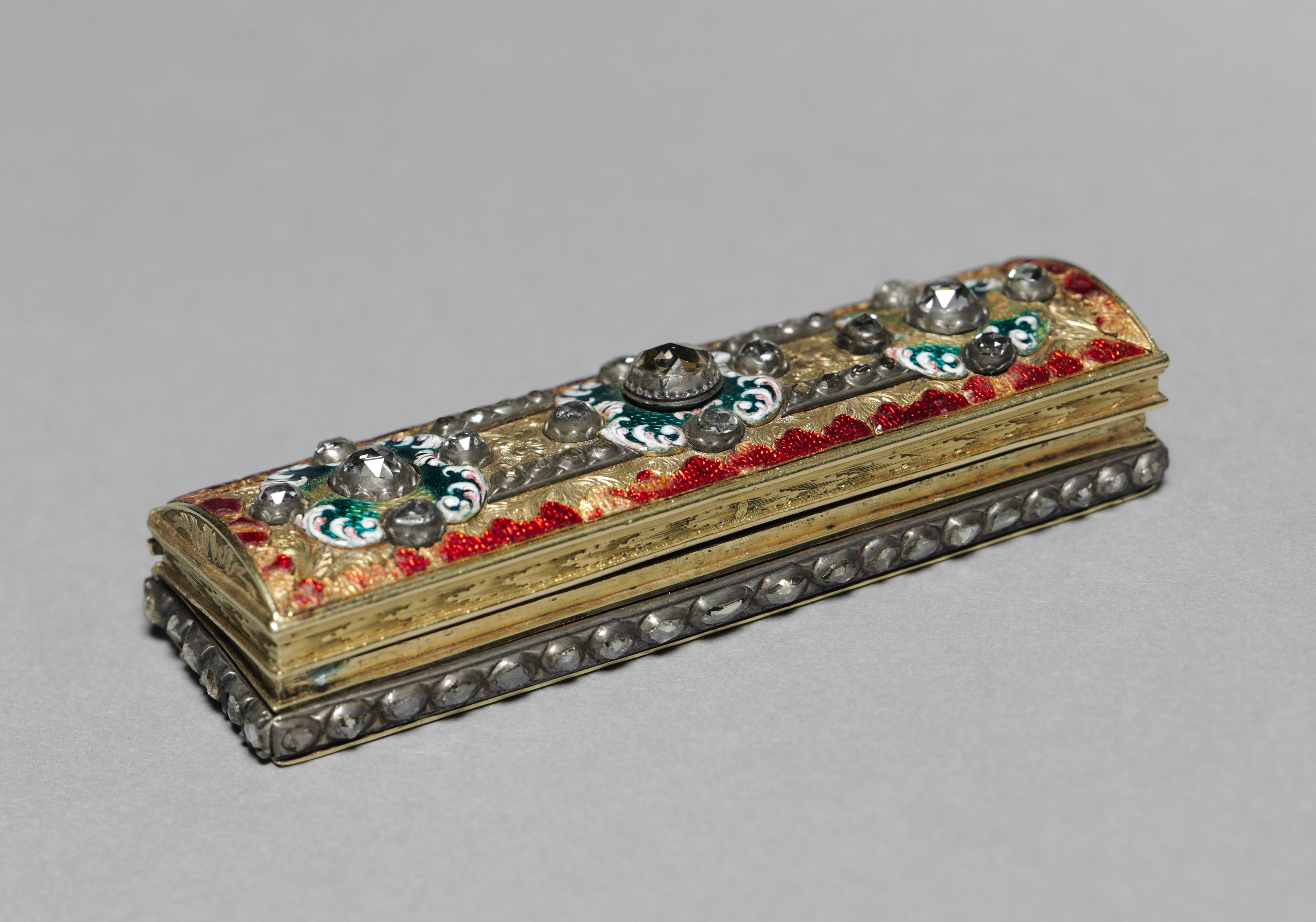 Rectangular box with rounded edges, gold-colored top and sides, and a silver-colored bottom. The top has a raised pattern with red, white, green, and gold details. There are several large clear gems and smaller ones along the sides. The box has a hinged lid and appears to be made of metal. The background of the image is gray. Title: Box Artist: Unknown