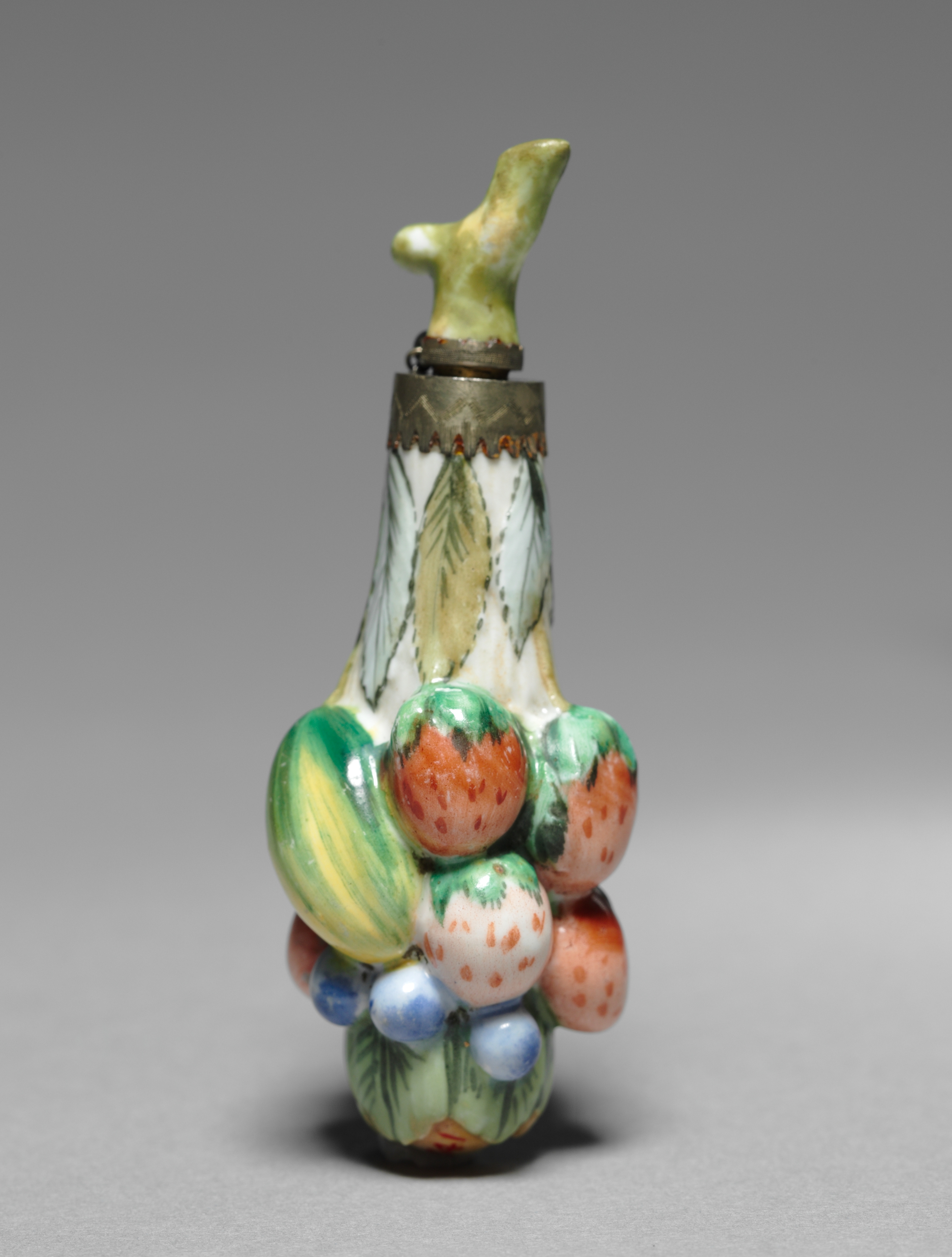The object is a scent bottle. The bottle features a white base color with green leaves painted on it. A metal band encircles the top of the bottle. The bottle's stopper resembles a stem. The body of the bottle is adorned with colorful fruits including green, orange with red spots, blue, and yellow. The fruits are clustered together at the bottom of the bottle. The background of the image is a solid gray color.