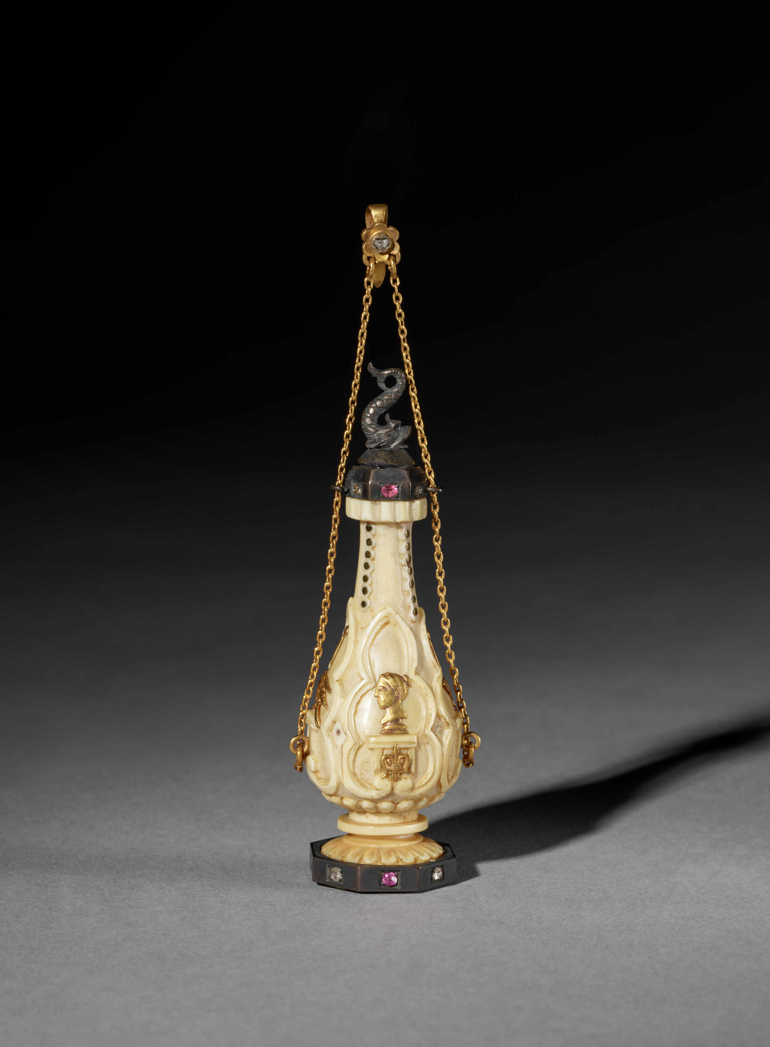 Scent bottle by Fabergé, gold stopper on a short chain attached to a screw cap adorned with a ruby and diamonds. Cream-colored body features piercings at the top, with etched designs and a lion mask on the bottom. A black base with gems encircles the bottom. Grey gradient background.
