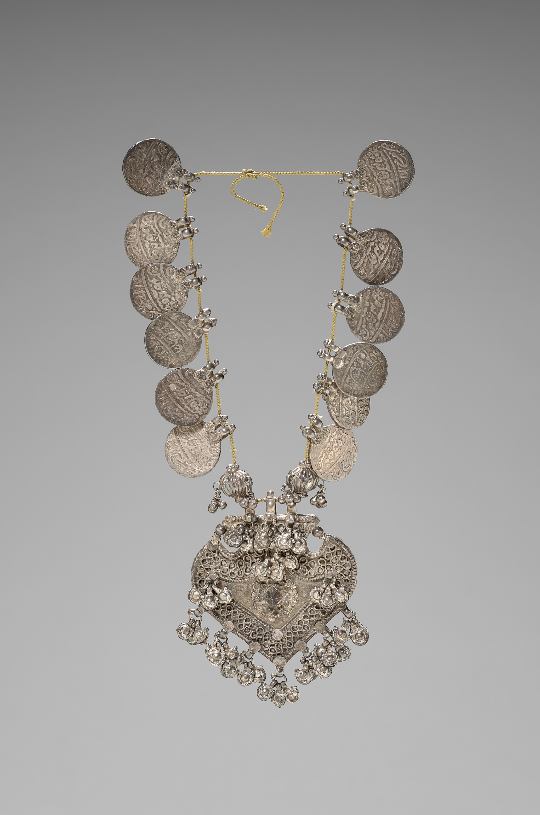 The Necklace by an unknown artist depicts a necklace made of silver or gray metal, comprising numerous round medallions, some featuring engraved designs. The necklace has a central pendant adorned with intricate details and smaller dangling pieces. Two yellow cords connect to a heart-shaped loop at the top. The background is gray.