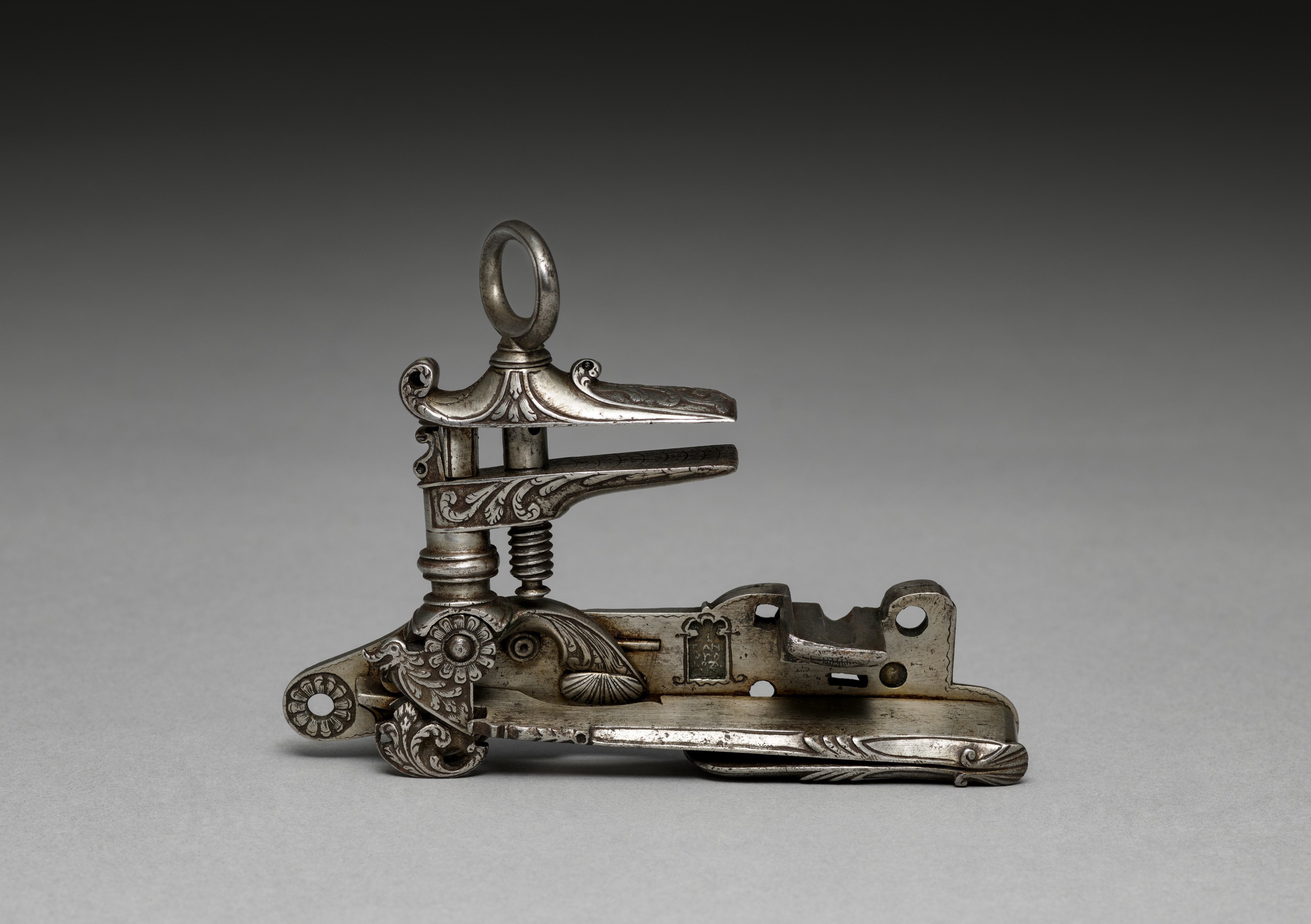 Metal object with intricate designs; gun mechanism; has a flat base; spring-loaded part; ornate details on surface; titled "Snaphance Gunlock" by an unknown artist.