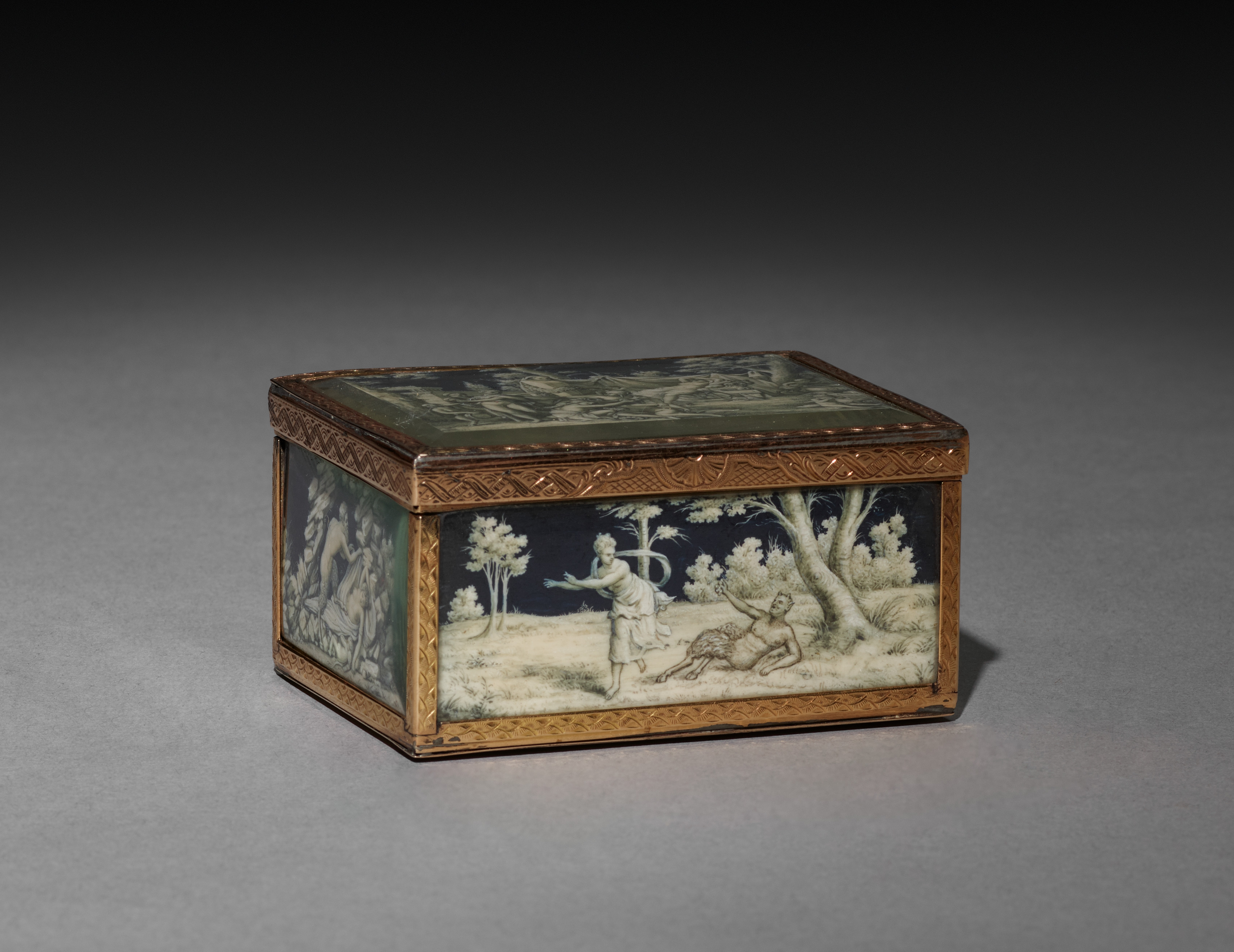 Rectangular box with gold border, green and white illustrations on sides and top. The box has a flat top and straight sides. The top is green with trees. The right side shows a white and black illustration of a man and woman outdoors with trees. The left side shows an illustration of people outdoors. The gold border has an etched design. The box sits on a gray surface with a black background. The box is titled "Box" and is by an unidentified artist.