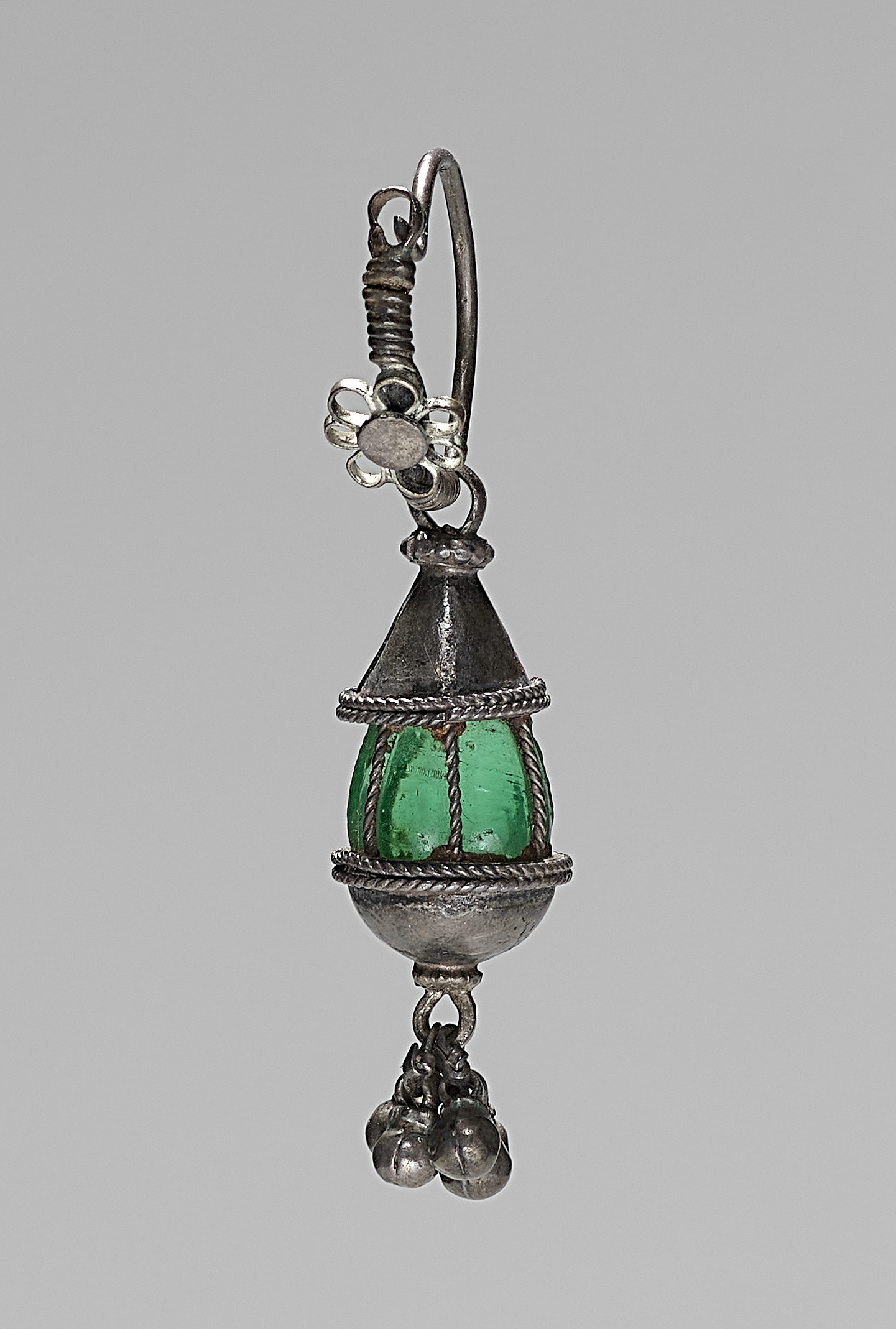 Earring by Artist. Silver earring with green stone. The earring has a silver hoop with a flower-shaped charm attached to it. The main body of the earring is a green stone encased in a silver cage. The cage has a rope-like design around the middle and a cone-shaped top. There are small silver balls hanging from the bottom of the earring. The background of the image is gray.