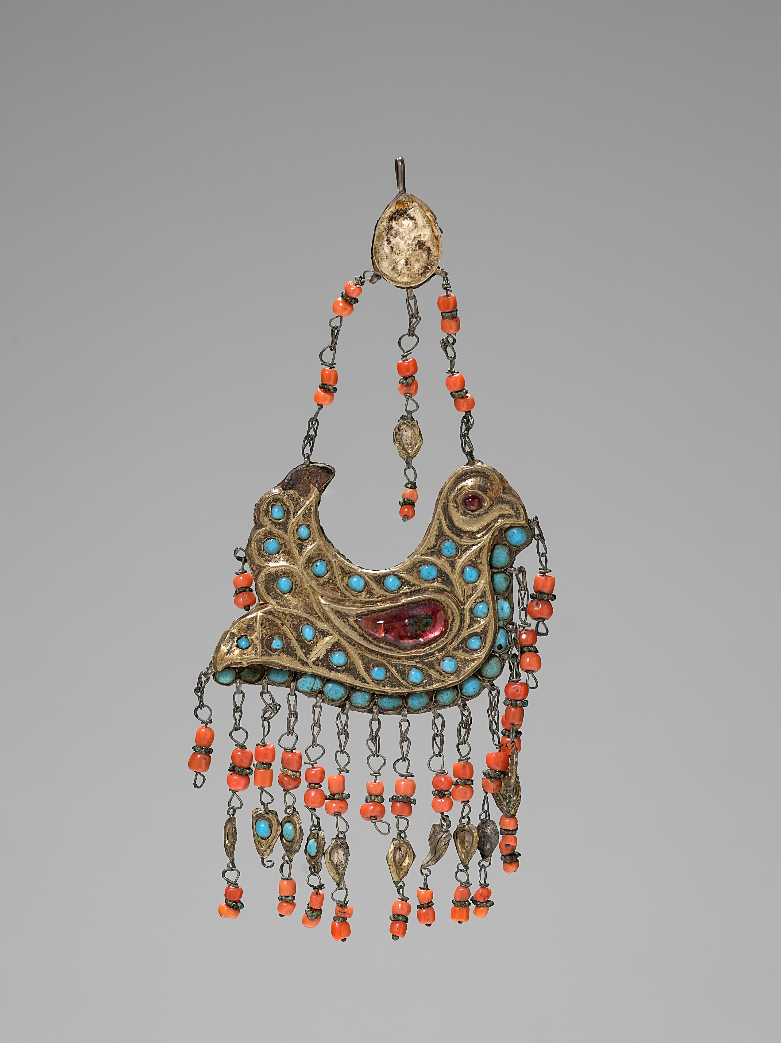 Gold pendant in the shape of a bird with its wings spread, featuring turquoise stones along the wings and a large red stone on the body. The pendant has a loop at the top with a small gold circle and chains adorned with orange beads. Several strands of chains with orange beads and gold and turquoise pieces hang from the bottom. Pendant by Artist.